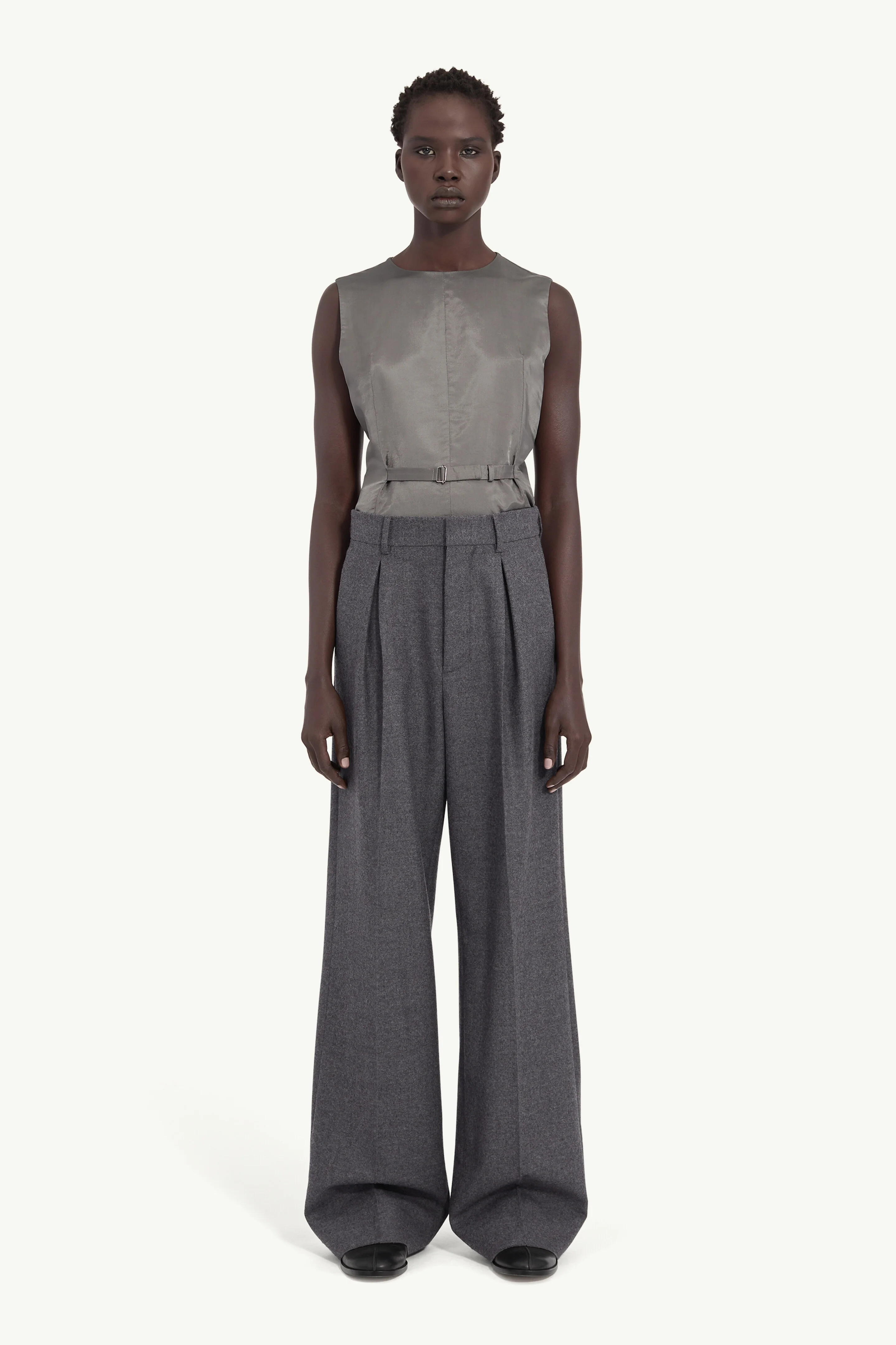 These pleated wool trousers nod to classic tailoring, reimagined with extra length and a fluid drape. Cut for structure but easy in movement, they sit high on the waist for a refined play on proportion. A subtle stitch at the back marks MM6’s deconstructive touch. Product Details Item ID S52KA0540M35466860M Primary Fabric: 100% Virgin Wool Pocket Lining: 100% Viscose-Rayon Straight-leg trousers in virgin wool High-rise waistband with belt loops Darted front and pressed pleats Side seam pockets and back welt pocket White stitch line at the back Made in Italy Model is 180 cm tall and wears a size 42.