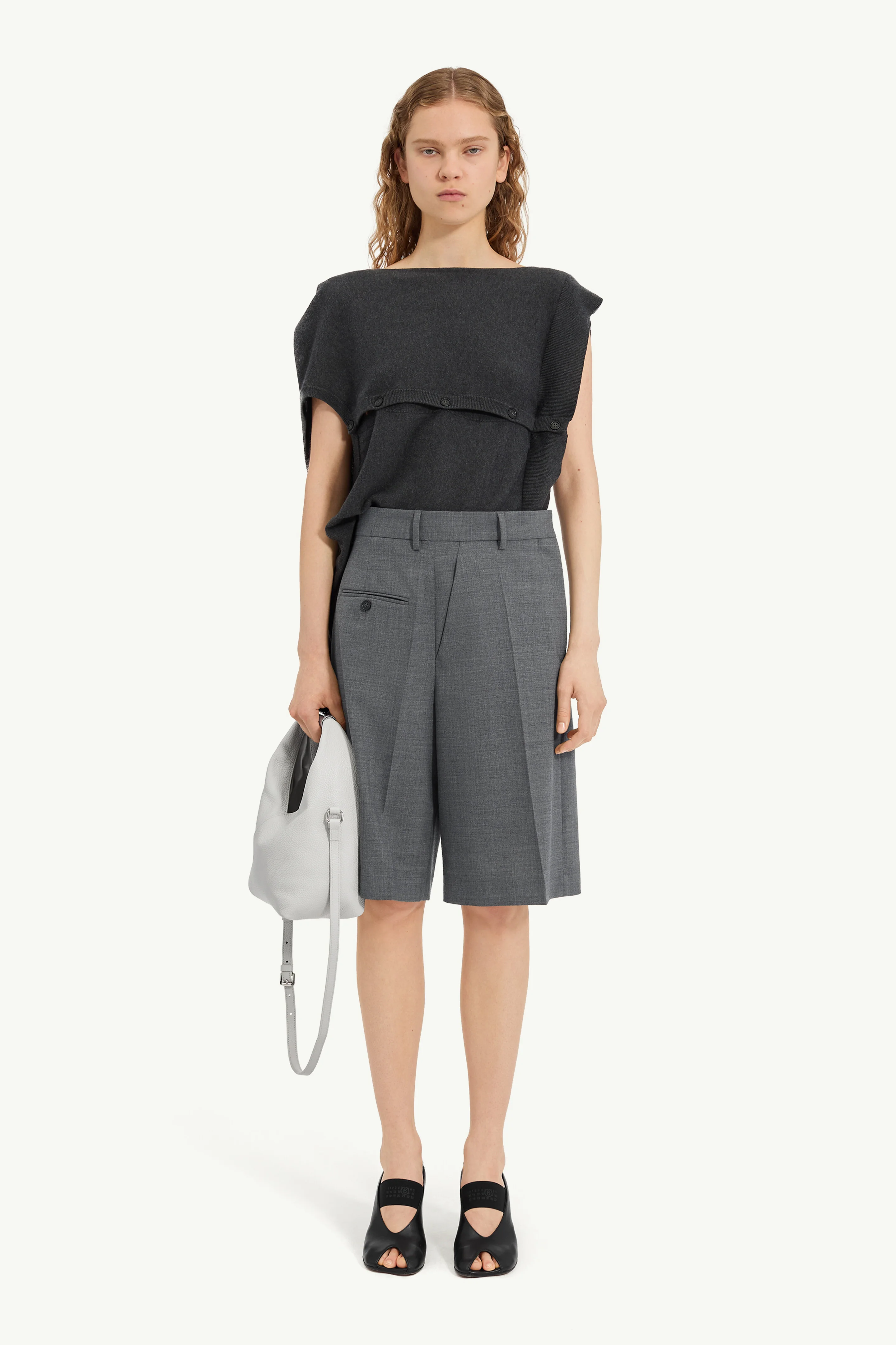 Crafted in a wool blend, these shorts distort the familiar codes of tailoring with reversed paneling that creates a subversive, back-to-front impression. The structured cut contrasts with its twisted detailing, embodying MM6’s deconstructive spirit. Marked at the back by the white stitch line. Product Details Item ID S52MU0125M35733860M Primary fabric: 54% polyester 44% wool 2% elastane-spandex Pocket lining: 100% viscose-rayon Tailoring wool blend Bermuda shorts, wide leg Zip and button front closure White stitch line at the back Made in Italy