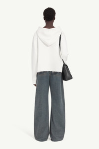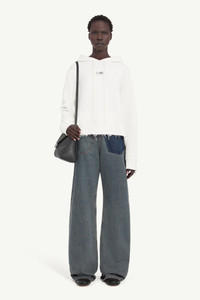 A play on proportions and texture. This hooded sweatshirt reinterprets a wardrobe staple with raw, undone edges and a boxy fit. The MM6 numeric patch punctuates the chest, reinforcing the Maison's deconstructed approach to casualwear, while the white stitch line at the back adds its quiet signature. Product Details Item ID S52GU0234M25025101 Primary fabric: 100% Cotton Drop shoulder boxy hoodie with raw hem Boxy silhouette with dropped shoulders Hood with adjustable drawstrings Kangaroo pocket at the front Raw, frayed hemline detailing Long sleeves, ribbed cuffs Small logo patch centered on chest White stitch line at the back Model 1 is 180 cm tall, model 2 is 190 cm tall and wears a size M.