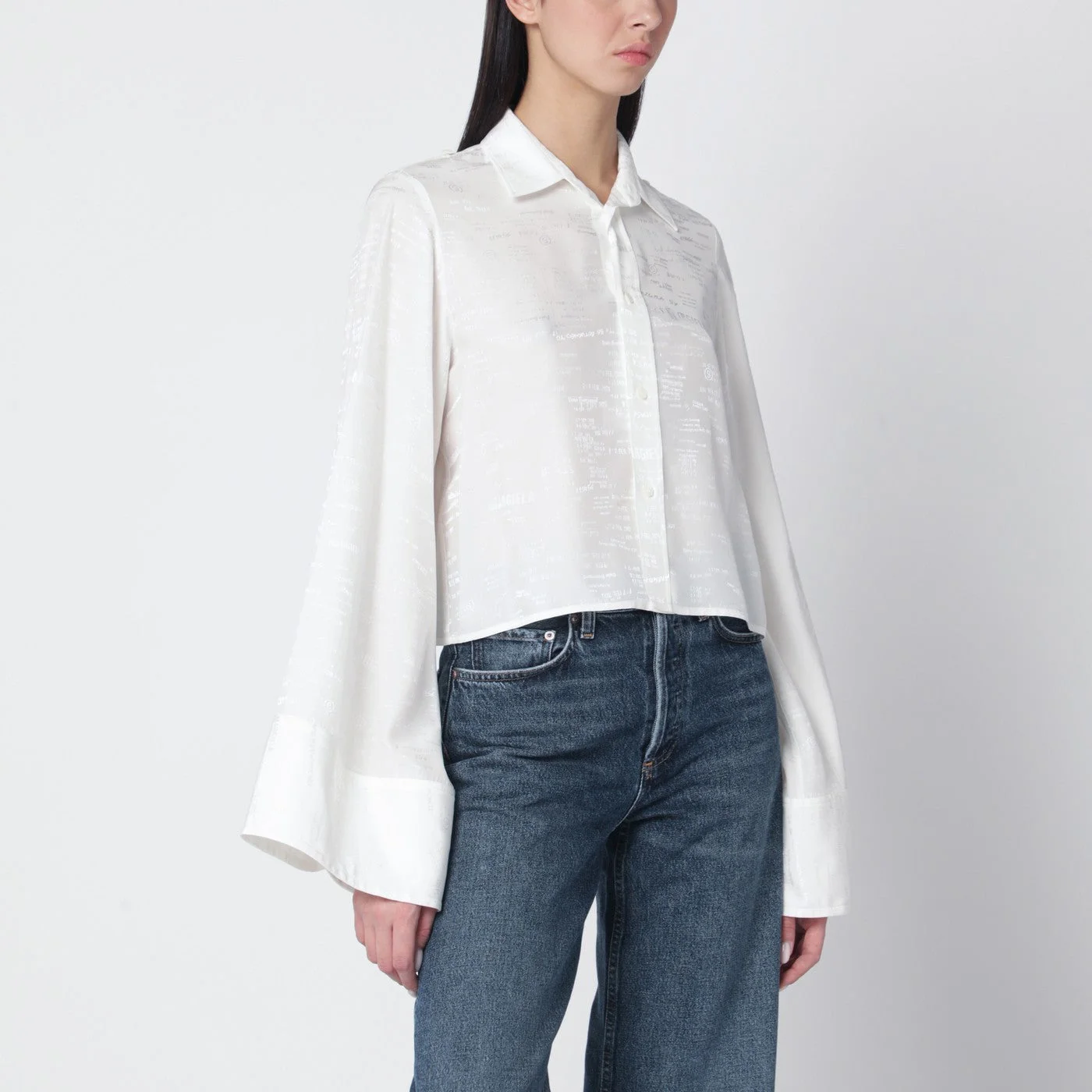 MM6 Maison Margiela shirt in white viscose-blend jacquard• All-over graphic logo print• Classic collar• Front button fastening• Long sleeves with accentuated cuffs that can be turned up to become short sleeves• White stitch line on the back