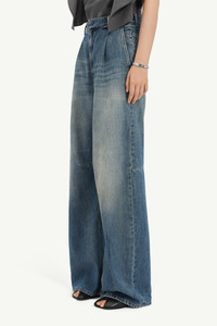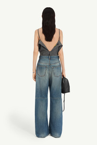 In washed cotton denim, these wide-leg jeans carry the tension between craft and subversion. A reduced panel construction shapes the legs with visible breaks, while fading and tobacco yarn stitching add texture and detail. Finished with the Maison's numeric artwork tab at the waist and white stitch line at the back. Product Details Item ID S52LA0269M30055961 Primary fabric: 100% cotton Pocket lining: 65% polyester 35% cotton Full-length wide-leg fit Zip and button closure at the front White stitch line at the back