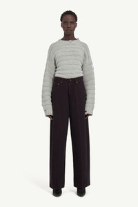 These jeans feature an exaggerated wide-leg silhouette with sculptural volume. Front seams are shifted outward to create the illusion of an inside-out construction – an offbeat twist on traditional tailoring. At the back, the MM6 white stitch line marks its signature. Product Details Item ID S52LA0264M30032227 Primary Fabric: 100% Cotton Pocket Lining: 100% Cotton Wide-leg denim trousers Classic five-pocket construction Exposed seamwork to the front Zip button closure with belt loops Numeric signature label to the rear White stitch line at the back Made in Italy Model is 180 cm tall and wears a size 28.