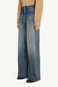 These jeans reinterpret workwear codes with a directional twist. Crafted from mid-wash denim with heavy fading and whiskering, they feature a wide-leg silhouette with horizontal seams that break the leg line. A raw-edged waistband reinforces the lived-in feel while the MM6 white stitch line signs off the design with quiet precision. Product Details Item ID S52LA0266M30017962 Primary Fabric: 100% Cotton Pocket Lining: 65% Polyester 35% Cotton Wide-leg denim trousers Classic 5-pocket construction Articulated knee panels Belt loops Zip fly with button closure Numeric signature patch at the rear White stitch line at the back Made in Italy Model is 180 cm tall and wears a size 28.