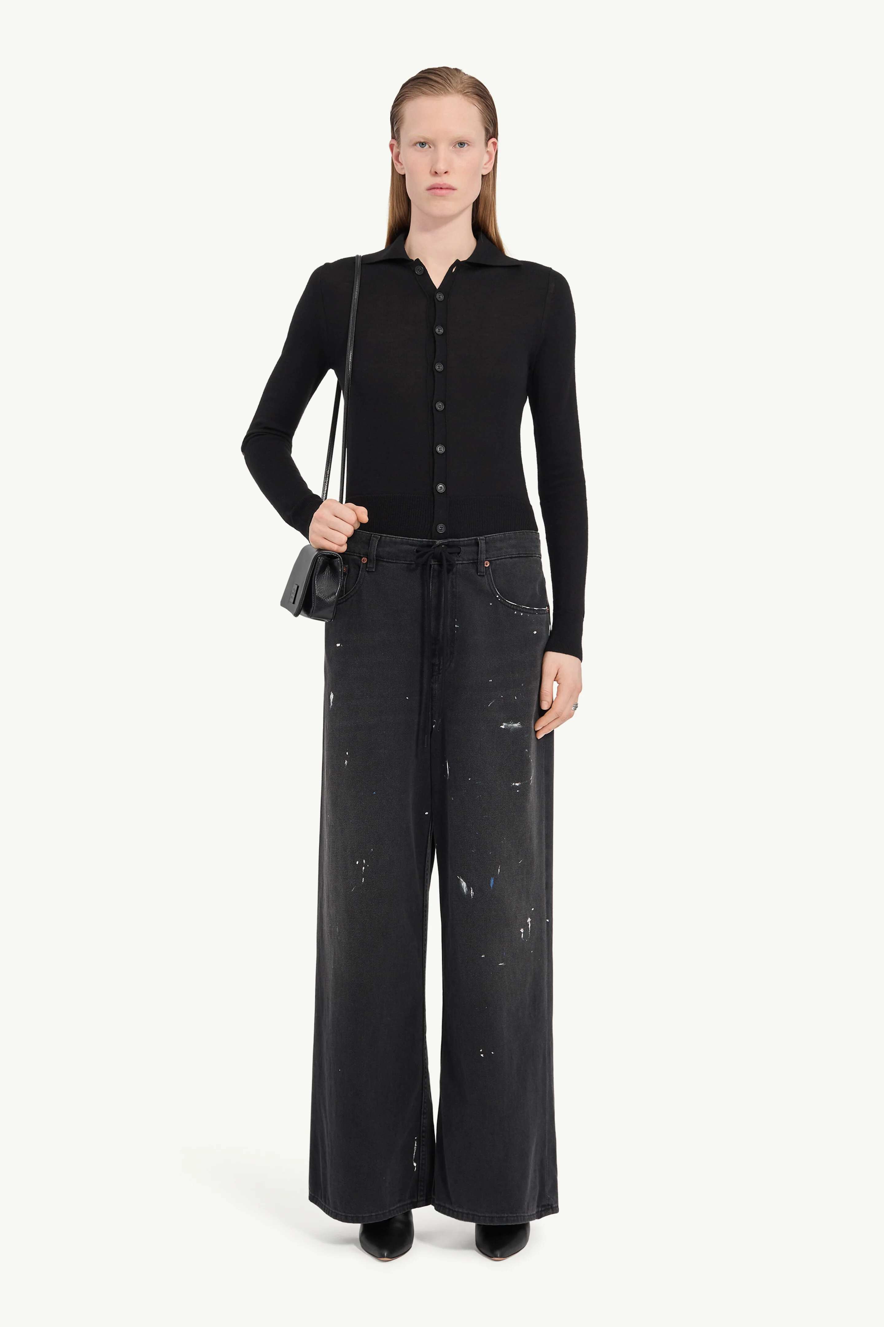 Cut in an oversized, wide-leg silhouette, these denim jeans are subtly distressed with paint specks, evoking a lived-in atelier-worn feel. A drawstring waistband softens the structure, introducing a relaxed, deconstructed attitude. The white stitch line at the back discreetly marks the piece with the Maison’s signature. Product Details Item ID S52LA0262M30011966 Primary Fabric: 100% Cotton Pocket Lining: 65% Polyester 35% Cotton Wide-leg denim jeans with paint detailing Classic five-pocket construction Drawstring waist with belt loops Tonal numeric signature label White stitch line at the back Made in Italy Model is 180 cm tall and wears a size 28.