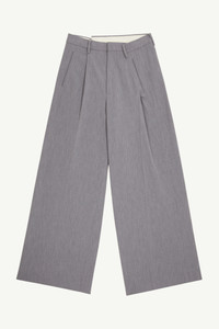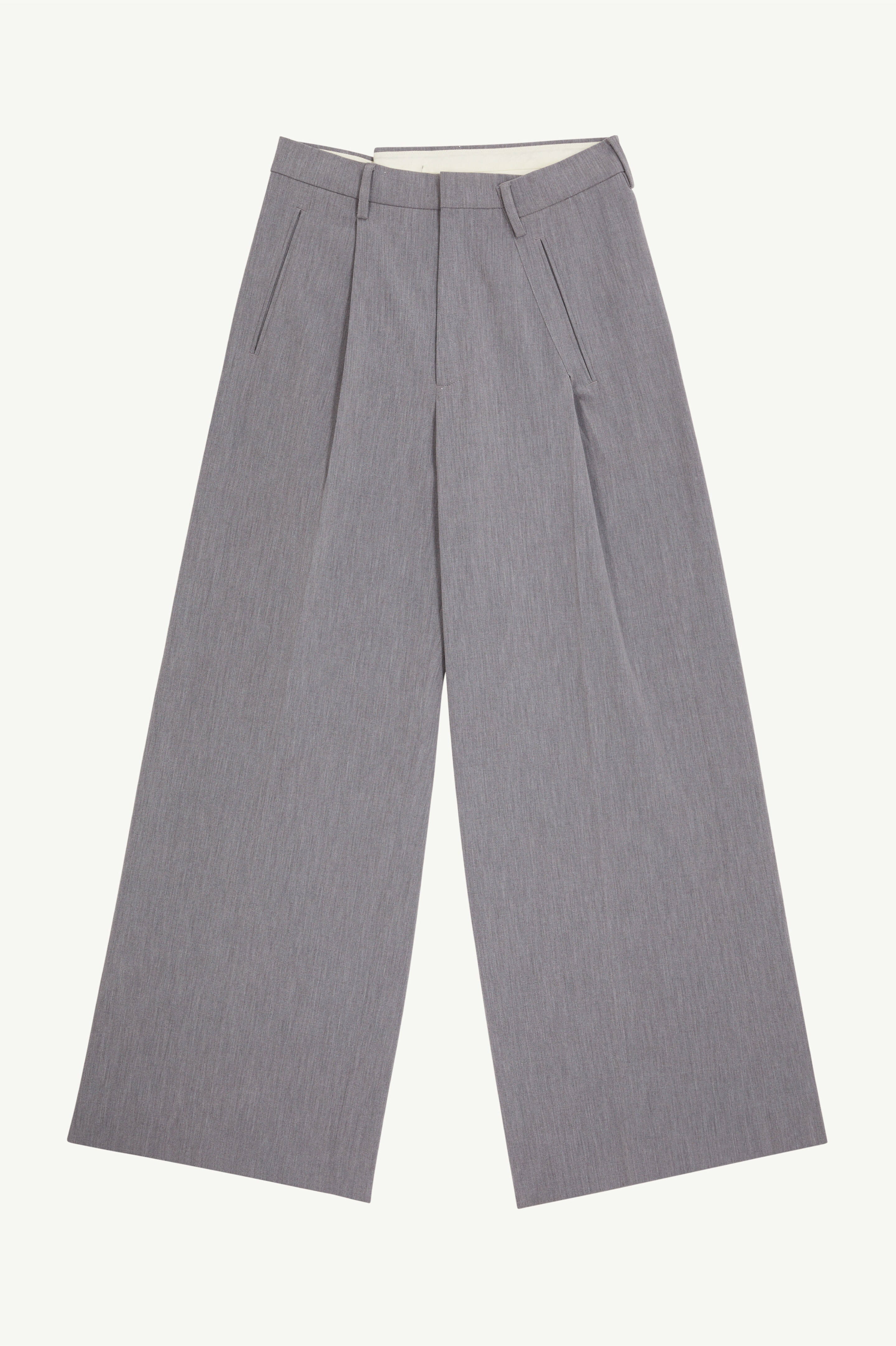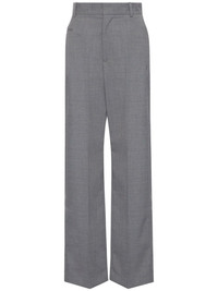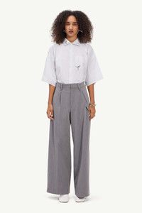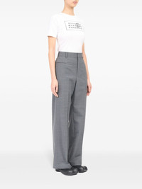 Wide-leg trousers cut from stretch viscose. Classic tailoring elements like front darts and pleats are disrupted by the intentional break at the front and back of the waist. MM6’s discreet yet distinct signature, a horizontal white stitch line, is present on the back of the trousers. Model is 178cm tall and wears size 40.