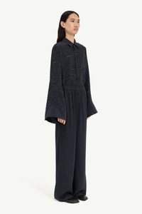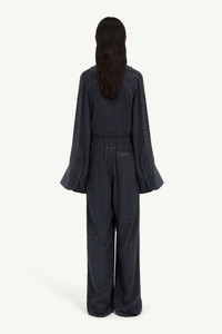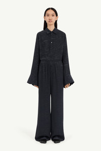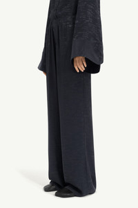 Wide-leg trousers in a viscose blend jacquard with an elasticated waistband, buttoned front detail, and the Maison’s numeric artwork at the waist. The relaxed cut is enhanced by side slits at the hem, introducing ease of movement and fluid drape. At the back, the MM6 white stitch line highlights its signature. Product Details Item ID S52KA0529M35737002J Primary fabric: 58% acetate 42% viscose-rayon Full-length wide-leg pants Elasticized waistband closure White stitch line at the back Made in Italy