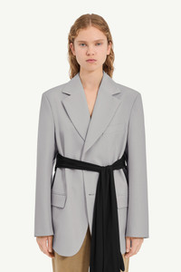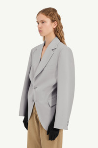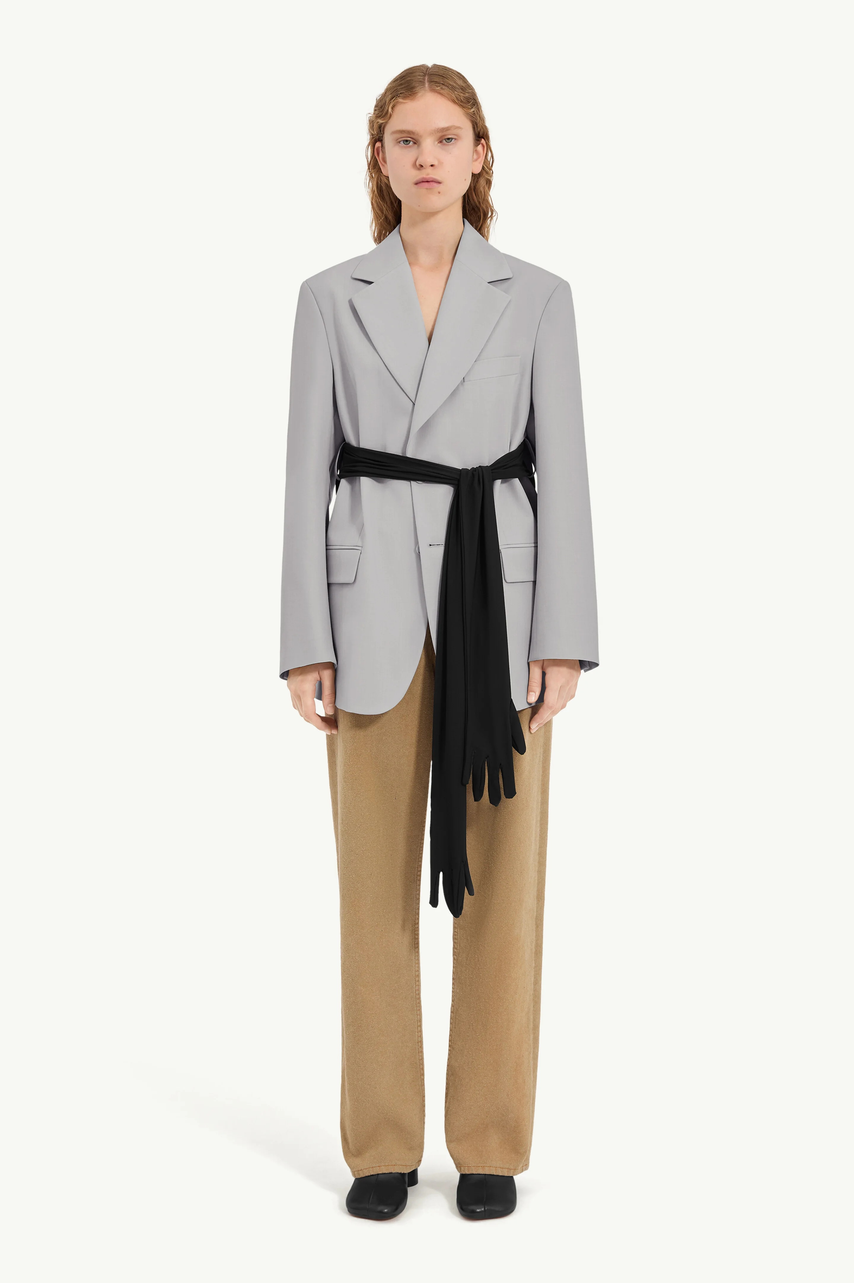 A tailored blazer in light wool blend with flap pockets and a single-breasted front. At the waist, black Lycra gloves are attached: left loose, the piece remains minimal; when worn, they alter its shape. A straightforward mechanism that transforms tailoring into adaptable design. Finished with the MM6 white stitch line at the back. Product Details Item ID S52BN0147M35436858 Primary fabric: 55% polyester 45% virgin wool Lining: 100% viscose-rayon Light wool blend Long sleeves Shirt collar Front closure with button White stitch line at the back Made in Italy