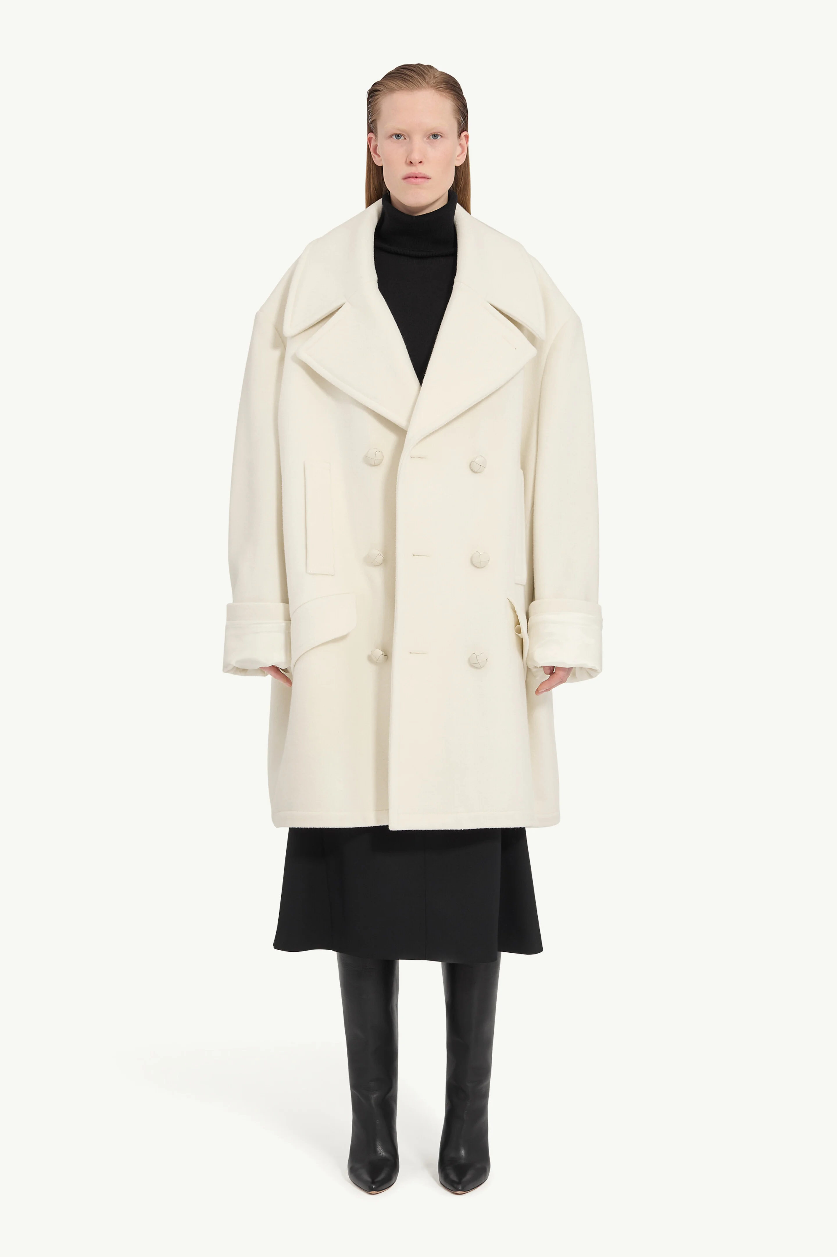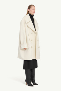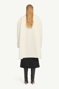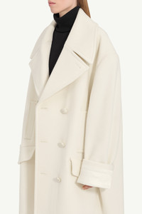 An oversized interpretation of classic tailoring, this double-breasted coat disrupts proportion with exaggerated lapels and a generous silhouette. Subtly deconstructed details reflect MM6’s signature approach to reworking familiar forms. At the back, the Maison’s white stitch line offers a quiet signature. Product Details Item ID S52AA0195M35469102 Primary fabric: 78% Wool, 22% Polyester Lining: 100% Viscose-Rayon | Pocket lining: 100% Cotton Double-breasted coat with notch lapel collar Oversized with dropped shoulders Six covered buttons in two rows Two front vertical welt pockets Two flap pockets below welt pockets Wide cuff detail with visible lining Center back seam visible White stitch line at the back Made in Italy Model is 180 cm tall and wears a size M.
