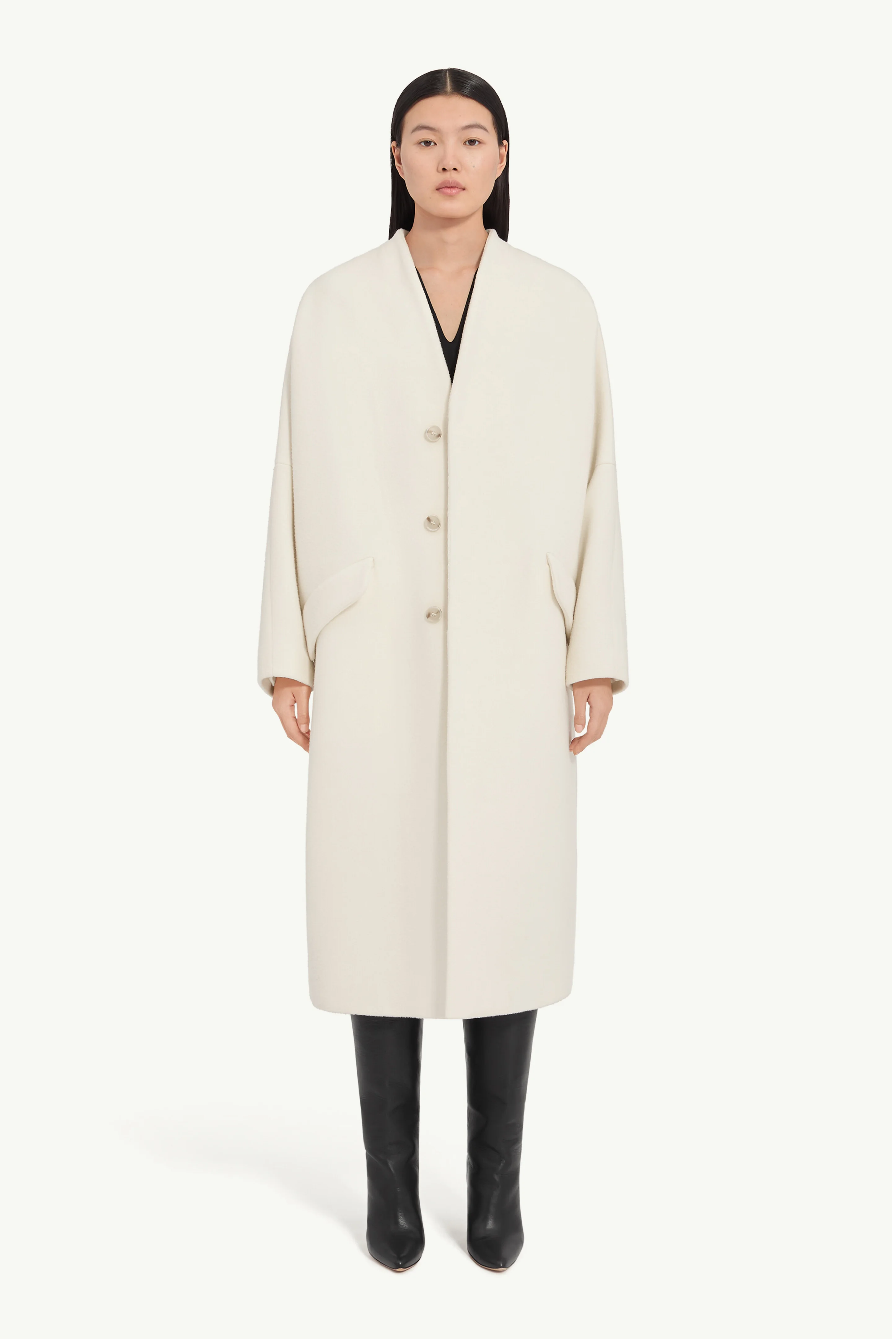 This wool coat reinterprets traditional outerwear through a modern, deconstructive lens. Its sleek, collarless design streamlines the silhouette, while oversized pockets introduce a utilitarian contrast. A quiet yet distinctive reinvention of a wardrobe essential, finished with the Maison’s signature white stitch line. Product Details Item ID S52AA0192M35469102 Primary fabric: 80% Virgin Wool, 20% Polyester Lining: 100% Viscose-Rayon | Pocket lining: 100% Cotton Oversized coat, virgin wool blend, V-neck V-neckline Button closure with four buttons Long sleeves, dropped shoulders Wide cuffs Two front flap pockets Seam detailing on shoulders Seam detailing on sleeves Mid-length coat, extends below the knee Back is plain White stitch line at the back Made in Italy Model is 179 cm tall and wears a size 42.