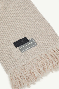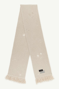 Knitted from soft wool, this elongated scarf features distressed stitches and a textural raw fringe. The reversed MM6 signature and numeric artwork patch disturbs the symmetry, offsetting the knit’s rhythm with a note of visual interruption. An accessory reworked into statement. Product Details Item ID S52TE0056M13138806M Primary Fabric: 80% Wool 20% Polyamide-Nylon Oversized rib-knit scarf Distressed detailing Long fringe trim Dual artwork patch at the hem Made in Italy