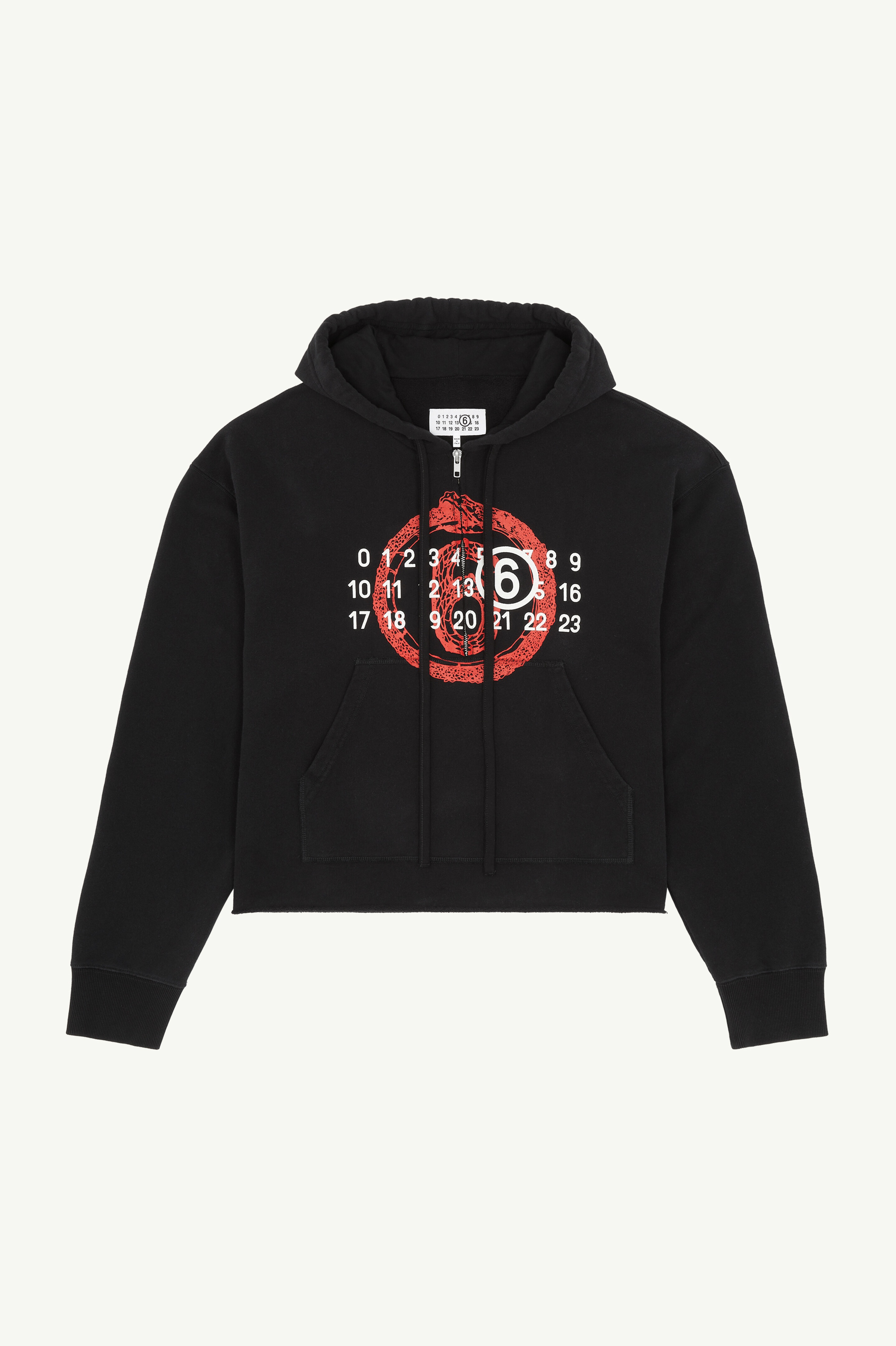 An oversized hoodie that honours the Lunar New Year with its numeric signature and distinctive red 'Year of the Snake' print. The drawstring hood, front pocket, and half-zip detail add functionality, while the drop sleeves and relaxed fit offer effortless wearability steeped in symbolism. Product Details Item ID S62GU0136M25014900 Primary Fabric: 100% Cotton Lining: 100% Cotton Brushed sweat jersey hooded sweatshirt MM6 numeric signature and Year of the Snake print at the front Zip neck Dropped shoulder Front pocket Raw-edge hem Ribbed cuffs White stitch line at the back Made in Italy