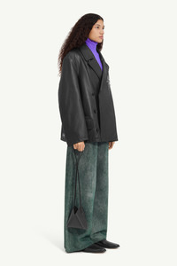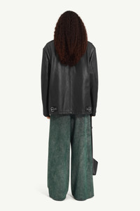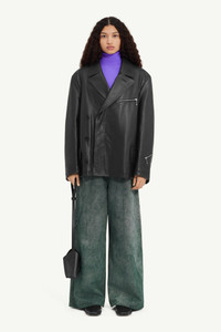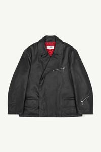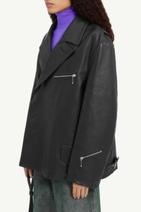 A bold leather jacket with peak lapels and double-breasted closure. Featuring zip and flap pockets, it embodies MM6's innovative spirit and deconstructed style. The Maison's discreet white stitch at the back adds a signature touch, capturing the essence of its creative process. Product Details Item ID S62AN0137M07005900 Composition: 100% calf leather Lining: 100% viscose-rayon Pocket lining: 100% cotton Leather jacket Peak lapels Double-breasted button closure Zip pocket Flap pockets Zip pocket on cuff White stitch line at the back Made in Italy