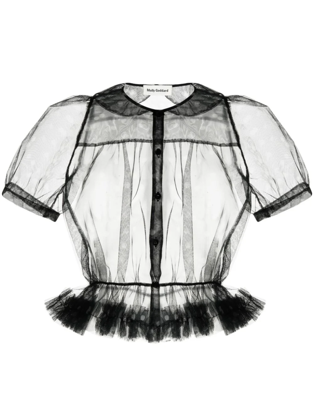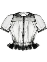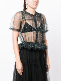 ruffled polka-dot tulle shirt Highlights - Black - Polka dot print - Sheer coverage - Ruffled detailing - Peter pan collar - Fitted waistline - Front button fastening - Short puff sleeves Made in United Kingdom Composition Nylon 100% SIZE & FIT Model measurements Height 5 ft 9 in(1.76 m) Bust/Chest 29.13 in(74 cm) Hips 33.07 in(84 cm) Waist 22.83 in(58 cm)