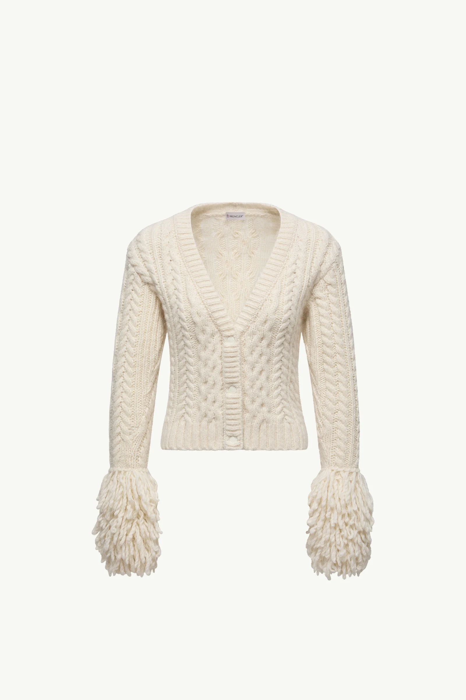 A textural twist on a seasonal staple, this V-neck cardigan from the women's collection is accentuated by a tactile trim. A creative take on the art of layering, this cardigan features a bold textured trim. Featured in a feminine V-neck shape, the heavy knit is crafted from a sophisticated alpaca blend. DETAILS - Crafted from an alpaca, nylon, wool and mohair blend - Cable and Aran stitch - Gauge 3 - V-neck - Button closure - Logo patch SIZE AND FIT - The model is wearing a size XS and is 180 cm tall - Regular fit COMPOSITION BASE FABRIC: 39% Alpaca, 25% Polyamide / Nylon, 22% Wool, 14% Mohair Product code K20939B00052M8190034 Made in Italy