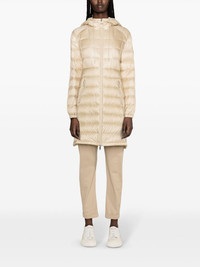 Amintore long quilted coat Moncler began in the French Alps in 1952 supplying mountain workers with warm jackets to suit the harsh climes. Continuing that legacy, this beige Amintore coat is made from recycled longue saison to a long fit-and-flare silhouette then quilted for even insulation. Its water-repellent properties and internal drawstring waist help block out the damp and draft. Highlights - Beige - Recycled shell - Down-feather filling - Padded design - Quilted - Lightweight construction - Drawstring hood - High neck - Long sleeves - Sleeve flap pocket - Logo patch at the sleeve - Elasticated cuffs - Two side zip-fastening pockets - Elasticated hem - Internal drawstring fastening waist - Above-knee length - Full contrast lining - Front two-way zip fastening Made in Italy Composition Lining: Polyamide 100%, Feather Down 100% Outer: Polyamide 100% SIZE & FIT Model measurements Height 5 ft 11 in(1.8 m) Bust/Chest 34.25 in(87 cm) Hips 35.82 in(91 cm) Waist 24.8 in(63 cm) FittingInformation Designed for a slim fit that sits just away from the body offering a close yet comfortable fit The adjustable drawstring means that you can adjust this piece’s fit to suit your comfort and preference Made from a padded non-stretch fabric, giving it no natural elasticity This piece fits true to size – take your usual size Washing instructions Machine Wash