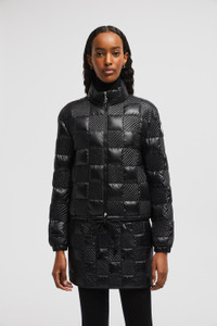 Defined by a quilted checkerboard motif, the Ancy short down jacket for women channels a '60s aesthetic. Crafted from longue saison, the Ancy down jacket offers lightweight warmth. Inspired by the '60s, this long jacket features a quilted checkerboard motif. DETAILS - Crafted from recycled longue saison - Longue saison lining - Down-filled - Zipper closure - Zipped pockets - Elastic cuffs - Hem with drawstring fastening SIZE AND FIT - The model is wearing a size 0 and is 178 cm tall - The model measures: bust 80 cm, waist 60 cm, hips 87 cm - Regular fit - Slim shoulders - Flared waist and hips COMPOSITION EXTERIOR: 100% Polyamide / Nylon; LINING: 100% Polyamide / Nylon; PADDING: 90% Down, 10% Feather Product code J20931A00052595ZZ999 Made in Romania