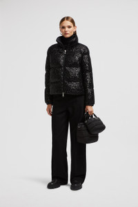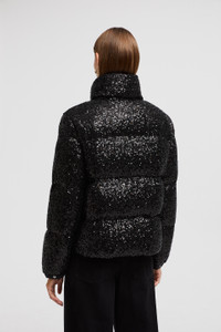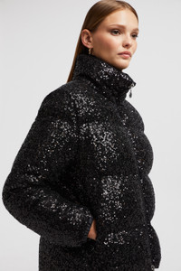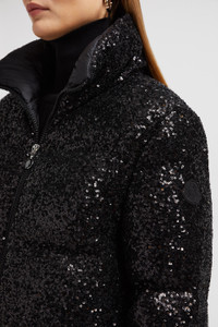 Playing with light, the Anternes short down jacket for women is embroidered with iridescent sequins. The joys of winter are captured in the Anternes down jacket for women. Crafted from tulle, the short puffer is entirely embroidered with glistening sequins that reflect light and evoke the crispness of morning snow. A classic fit, stand collar and an adjustable hemline make the standout piece comfortable to wear both in the city and during mountain getaways. DETAILS - Crafted from tulle - Longue saison lining - Down-filled - Zipper closure - Zipped pockets - Adjustable cuffs - Hem with drawstring fastening - Embroidered sequins SIZE AND FIT - The model is wearing a size 0 and is 178 cm tall - The model measures: bust 80 cm, waist 60 cm, hips 88 cm - Regular fit COMPOSITION EXTERIOR: 95% Polyester, 5% Elastane / Spandex; LINING: 100% Polyamide / Nylon; PADDING: 90% Down, 10% Feather Product code J20931A0016589AR2999 Made in Hungary