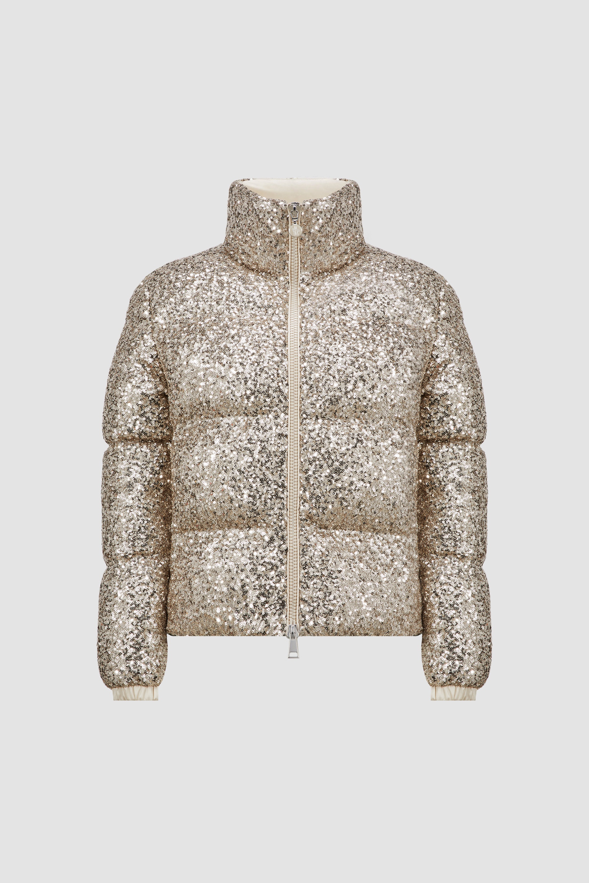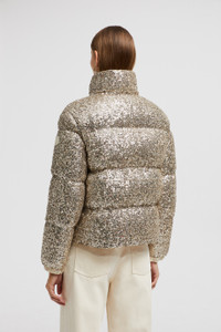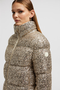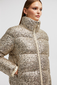 Playing with light, the Anternes short down jacket for women is embroidered with iridescent sequins. The joys of winter are captured in the Anternes down jacket for women. Crafted from tulle, the short puffer is entirely embroidered with glistening sequins that reflect light and evoke the crispness of morning snow. A classic fit, stand collar and an adjustable hemline make the standout piece comfortable to wear both in the city and during mountain getaways. DETAILS - Crafted from tulle - Longue saison lining - Down-filled - Zipper closure - Zipped pockets - Adjustable cuffs - Hem with drawstring fastening - Embroidered sequins SIZE AND FIT - The model is wearing a size 0 and is 178 cm tall - The model measures: bust 80 cm, waist 60 cm, hips 88 cm - Regular fit COMPOSITION EXTERIOR: 95% Polyester, 5% Elastane / Spandex; LINING: 100% Polyamide / Nylon; PADDING: 90% Down, 10% Feather Product code J20931A0016589AR2M14 Made in Hungary
