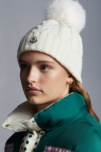 Crafted from a soft wool and cashmere blend, this cable knit beanie is finished with a plush pom pom. A timeless finishing touch, this soft beanie adds warmth and protection to city or mountain days. Crafted from a luxe wool and cashmere blend, the cable knit cap is finished with a faux fur pom pom. - Crafted from a wool and cashmere blend - Mix of braided stitching in gauge 5 - Pom pom in faux fur - Moncler logo - One size SIZE AND FIT - The model is wearing a size 1 and is 177 cm tall COMPOSITION AND CARE 1 MATERIAL: 93% Modacrylic, 7% Polyester; BASE FABRIC: 70% Virgin wool, 30% Cashmere Hand wash; Do not bleach; Do not tumble dry; Ironing maximum temperature 110°C - without steam; Do not dry clean; Do not professionally wet clean; Flat dry in the shade; Wash separately; Do not twist or wring; do not soak; It is advisable to wash and iron the garment on reverse. Product code H10933B00010M1503002 Made in Bulgaria