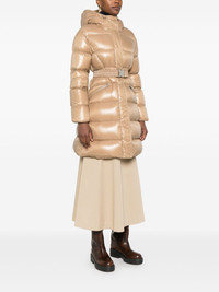 Bellevue coat Highlights - Beige - Glossy finish - Down-feather filling - Padded design - Front press-stud and zip fastening - Drawstring hood - Funnel neck - Long sleeves - Logo patch at the sleeve - Elasticated cuffs - Detachable belt - Two side zip-fastening pockets - Slight flare - Full lining - Drawstring hem Made in Italy Composition Lining: Polyamide 100% Filling: Goose Down 90%, Feather 10% Outer: Polyamide 100% SIZE & FIT Model measurements Height 5 ft 11 in(1.8 m) Bust/Chest 31.49 in(80 cm) Hips 36.61 in(93 cm) Waist 24.4 in(62 cm) FittingInformation Designed for a slim fit that sits just away from the body offering a close yet comfortable fit The belt offers adjustability for fitted preferences Made from a padded non-stretch fabric, giving it no natural elasticity Washing instructions Machine Wash