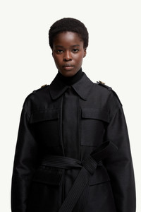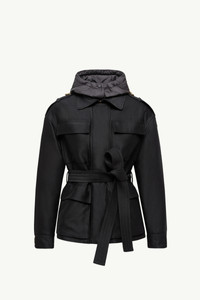 Elevating the classic field jacket, the Essalois puffer for women pairs elegant fabrics with a feminine silhouette. An elevated interpretation of the field jacket, the Essalois is crafted from twill. The material imbues the short down jacket with a silky soft feel and satin finish. Allowing the puffer to adapt to different weather conditions, a detachable hood adds versatility. A belt completes the warmer, accentuating the waist. DETAILS - Crafted from viscose and modal blend twill - Recycled polyester lining - Down-filled - Detachable polyester hood - Zipper and snap button closure - Patch pockets - Detachable belt - Adjustable cuffs - Leather logo patch SIZE AND FIT - The model is wearing a size 0 and is 180 cm tall - Regular fit - Drawstring allows personalization - Length (collar to hem): 68 cm COMPOSITION EXTERIOR: 86% Viscose / Rayon, 7% Modal, 7% Silk; LINING: 100% Polyester; HOOD LINING: 100% Polyester; HOOD: 100% Polyester; PADDING: 90% Down, 10% Feather; DETAILS PADDING: 100% Polyester;LEATHER TAG: CALF Product code K20931A00046598Q4999 Made in Romania