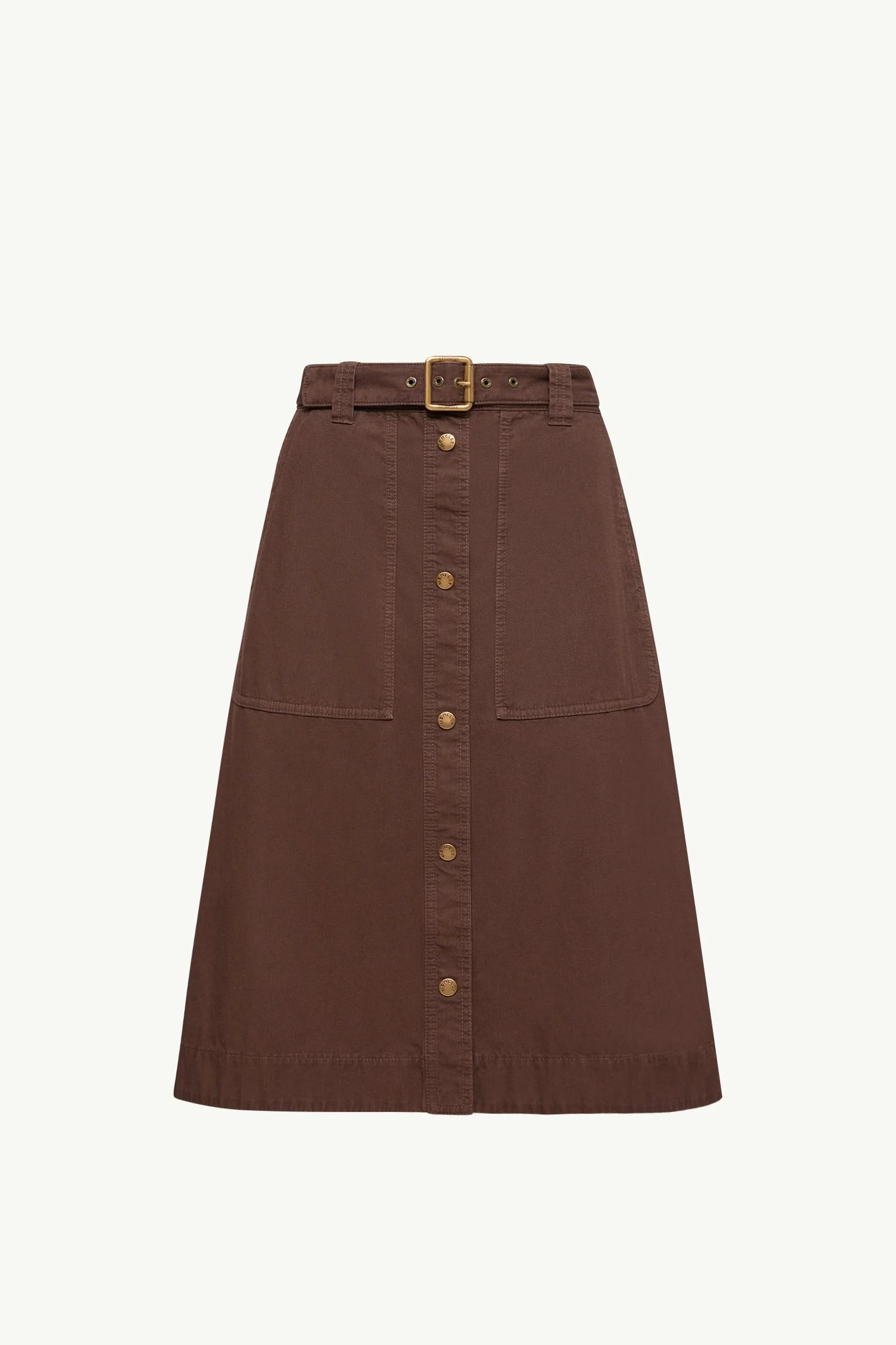 Reimagining a utilitarian aesthetic, this women's skirt strikes a contemporary balance of structure and texture. Crafted from cotton with a vintage effect, this knee-length skirt is at once understated yet striking. Contrast stitching, cargo pockets and a belted waistband complete the style. DETAILS - Crafted from cotton - Snap button closure - Pockets with snap button closure - Detachable belt SIZE AND FIT - label.sizeandfitmodels.woman.1 COMPOSITION BASE FABRIC: 100% Cotton Product code L10932D00034M9731458 Made in Albania