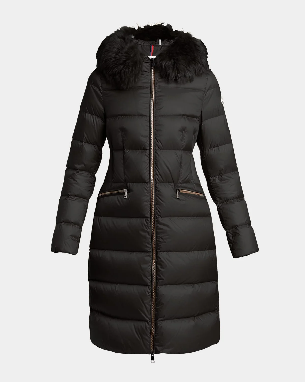 Insulated with premium down, the "Boedic" long jacket by Moncler is designed with detachable dyed longhaired shearling trim (China) that elevates the classic silhouette. Signature embroidered logo patch on the left sleeve Hooded neckline Long sleeves with elasticized cuffs Removable elastic belt with snap closure Side zip pockets Classic fit Midlength silhouette Twoway zipfront Nylon/polyamide Fill: Down/feather Dry clean or hand wash Imported