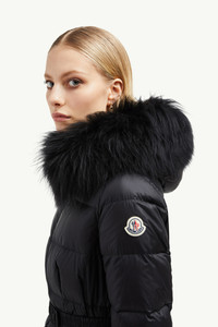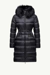 Protection and timeless elegance: the Boedic long down jacket fuses refined materials with attention to detail and a long-haired shearling trim. This Boedic long down jacket delivers a sophisticated winter look with a feminine silhouette defined by a belted waistline. The down coat's cozy hood is enriched with a luxurious long-haired shearling trim. The precious trim can be easily detached, depending on your mood or the weather conditions. DETAILS - Crafted from longue saison - Longue saison lining - Down-filled - Hood with detachable long-haired sheepskin trim - Zipper closure - Elastic belt with snap button closure - Zipped pockets with grosgrain details SIZE AND FIT - Regular fit - Fitted waist - Elasticized belt - Length (collar to hem): 95 cm COMPOSITION EXTERIOR: 100% Polyamide / Nylon; LINING: 100% Polyamide / Nylon; HOOD LINING: 100% Polyamide / Nylon; PADDING: 90% Down, 10% Feather;Leather with hair 1: SHEEP; Origin: China; Dyed Product code K20931C00015595FE999 Made in Armenia