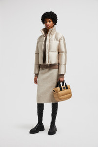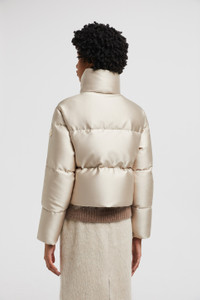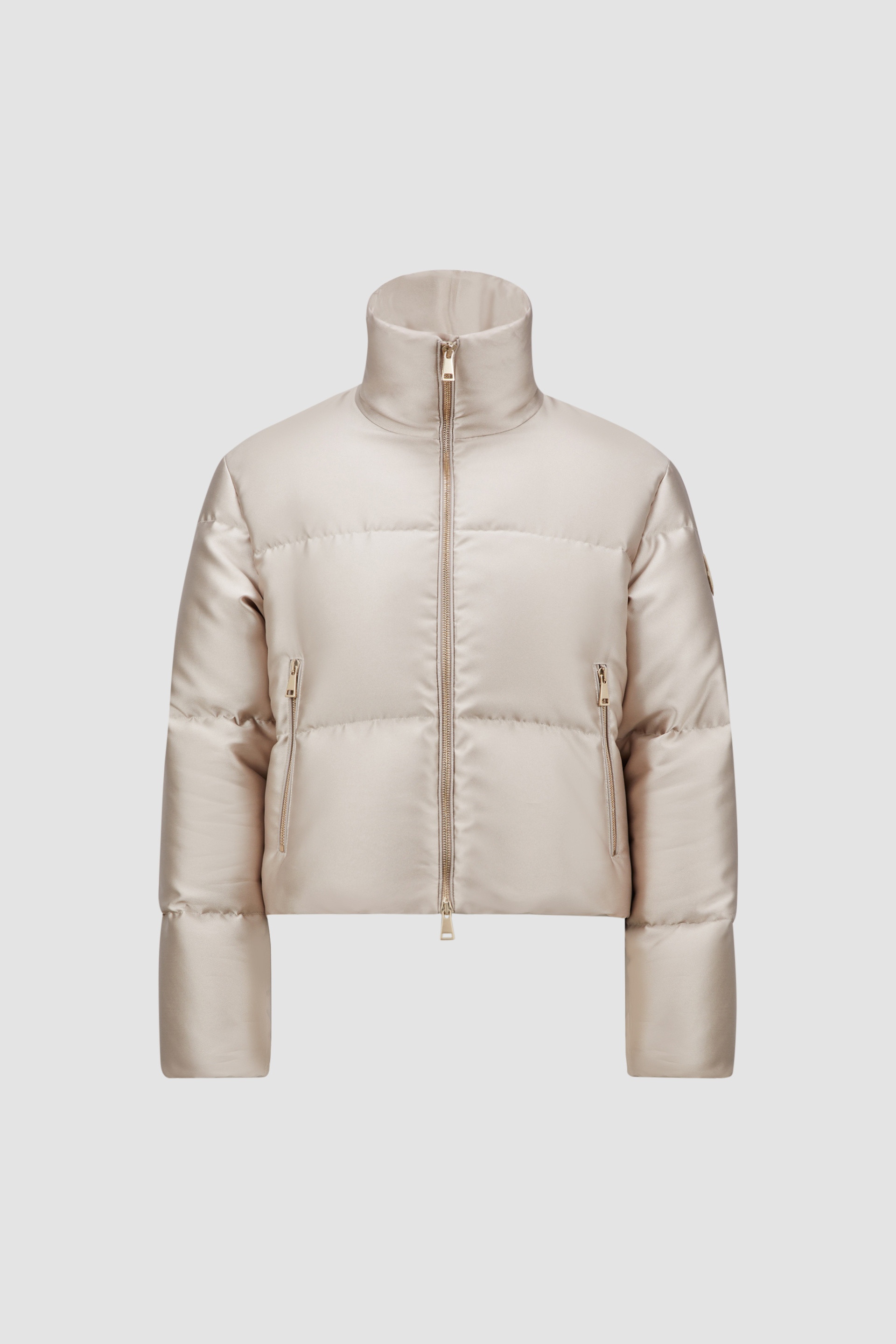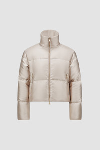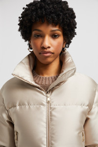 Characterized by an unexpected iridescent finish, the Bonnelles short down jacket for women channels the collection's feminine spirit. A fresh vision of a cold weather essential, the Bonnelles down jacket is made from duchesse with an iridescent finish. The short puffer is completed by a warm and cocooning stand collar, offering further protection from the elements. Featured in a subtle A-line silhouette, the warmer transitions seamlessly from the everyday to special occasions. DETAILS - Crafted from polyester duchesse - Longue saison lining - Down-filled - Zipper closure - Zipped pockets - Hem with drawstring fastening SIZE AND FIT - The model is wearing a size 0 and is 180 cm tall - The model measures: bust 81 cm, waist 60 cm, hips 87 cm - Loose fit COMPOSITION EXTERIOR: 100% Polyester; LINING: 100% Polyamide / Nylon; PADDING: 90% Down, 10% Feather;LEATHER TAG: COW LEATHER Product code J20931A00141597YK20K Made in Romania