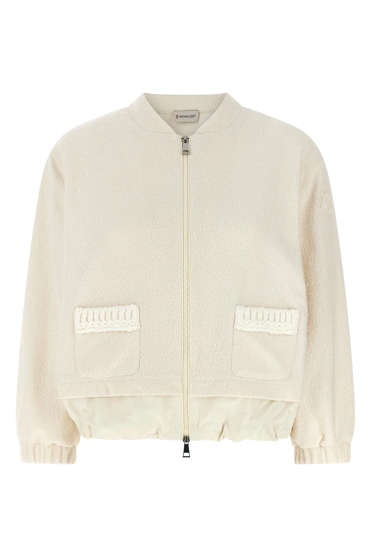 cod. L10938G0002689BDU050 Cardigan in light boucle fabric with flared silhouette, high neck, front zip closure, pockets with tone-on-tone knitted wool piping, long sleeves with elastic cuffs and felt logo patch applique, tone-on-tone nylon insert with drawstring on the hem. Color: White Size & Fit: true to size fit Composition: 100% polyester Made in: Moldova