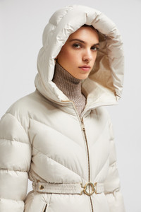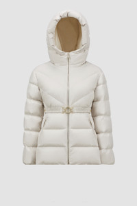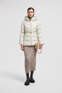 Lightweight and in a soft silhouette, the Brosse short down jacket for women is an instant classic. Designed for women with timeless taste, the Brosse short down jacket is crafted from polyester with an elegant matte finish. A logo belt at the waist completes the hooded puffer, creating a flattering A-line silhouette. The warmer transitions from day to evening or city to mountain with ease. DETAILS - Crafted from brushed polyester - Longue saison lining - Down-filled - Hood - Zipper closure - Zipped pockets - Elastic belt with logo buckle SIZE AND FIT - The model is wearing a size 0 and is 180 cm tall - The model measures: bust 78 cm, waist 58 cm, hips 88 cm - Regular fit COMPOSITION EXTERIOR: 100% Polyester; LINING: 100% Polyamide / Nylon; HOOD LINING: 100% Polyester; PADDING: 90% Down, 10% Feather Product code J20931A0010454AQE051 Made in Italy