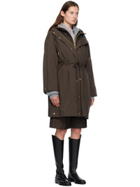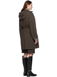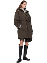 Plain-woven nylon and satin trench coat. · Drawstring at hood · Concealed two-way zip closure · Press-stud placket · Self-tie drawstring and welt pockets at waist · Press-stud vent at side seams · Dropped shoulders · Logo patch at sleeve · Adjustable press-stud cuffs · Detachable down-filled quilted vest-style underlay Supplier color: Brown Fill: 90% goose down, 10% goose feather. Body: 100% polyamide. Made in Romania 252111F061015