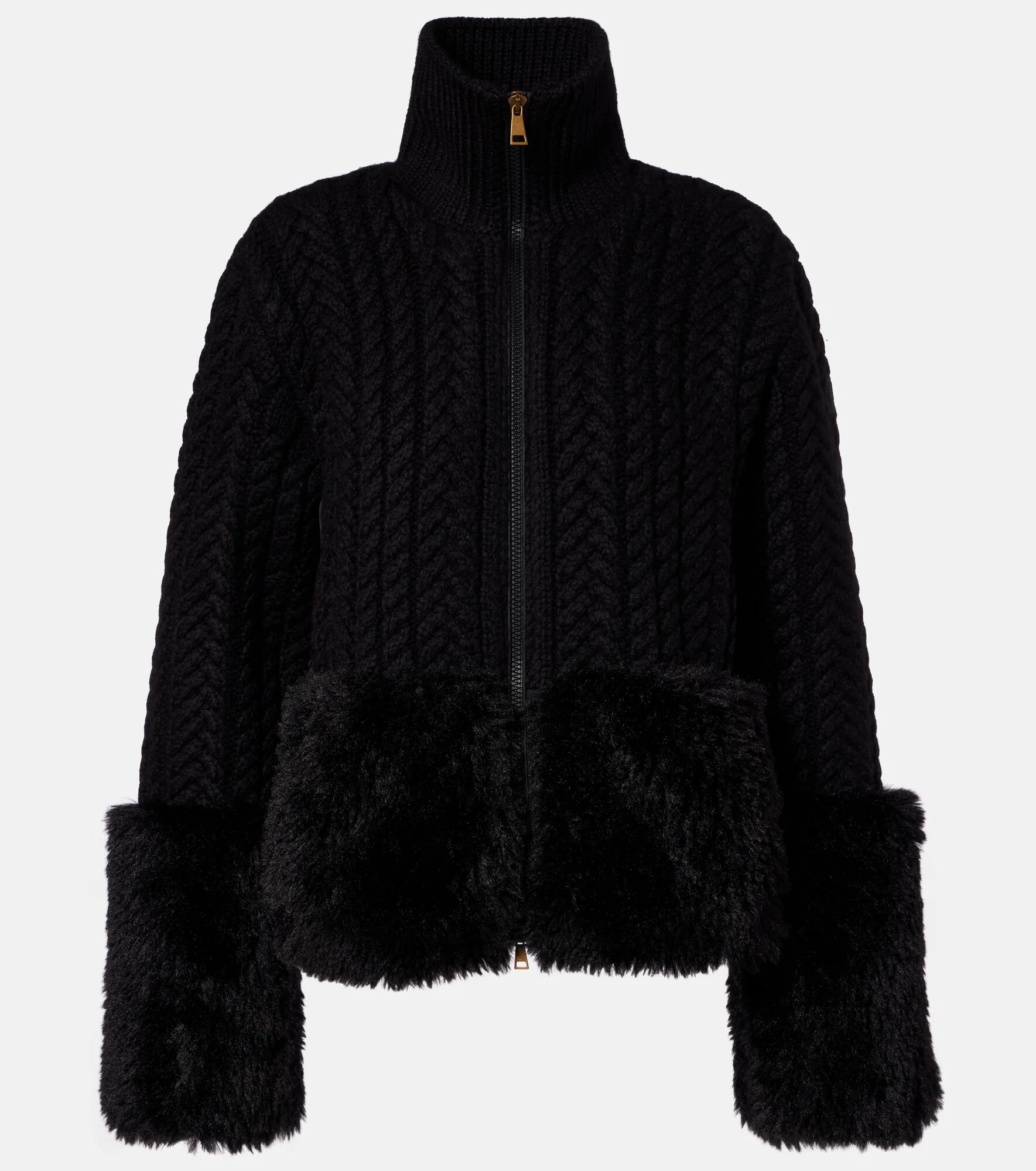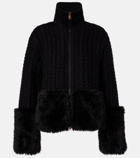 For a distinctive blend of textures, look to this zip-up cardigan from Moncler. The design is made from wool in a fine cable-knit, and finished with fuzzy trims on the hem and sleeves. Product Details - Material: 92% wool, 8% polyamide - Care instructions: dry clean - Made in Moldova - Designer color name: 999 - Item color: black - Lining: 70% polyester, 30% cotton - Lining II: 100% polyamide - Other inner trims: 100% polyamide - Filling: 100% polyester - Material II: 70% polyester, 30% cotton - Material III: 100% polyester - Closure: two-way zipped front, snap-buttoned sides - Hem: ribbed - Item number: P01101146 Size & Fit - True to size - Straight fit - Slightly stretchy fabric - Falls to the hip - The model seen in the picture is 178cm-5'10" and wearing a size XS