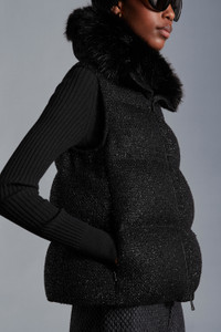 Best when styled in a sleek monochromatic palette, the Carrelet down vest adds a hint of texture to looks. Crafted in one of the season's key fabrics, tweed lamé, the Carrelet down vest is an embodiment of elegance. A luxurious faux fur collar, one of the key embellishments of the collection, adds a finishing touch to this feminine piece. - Crafted from metallic tweed - Nylon léger lining - Down-filled - Black faux fur collar - Zipper closure - Concealed double-zipped pockets - Embroidered grosgrain logo SIZE AND FIT - The model is wearing a size 0 and is 181 cm tall - The model measures: chest 76 cm waist 58 cm hips 88 cm - Regular fit - Cropped - Elasticized hemline COMPOSITION AND CARE EXTERIOR: 86% Virgin wool, 14% Polyamide / Nylon; LINING: 100% Polyamide / Nylon; PADDING: 90% Down, 10% Feather; 1 MATERIAL: 93% Modacrylic, 7% Polyester Do not wash; Do not bleach; Do not tumble dry; Ironing maximum temperature 110°C - without steam; Dry cleaning in tetrachloroethene or with hydrocarbons - mild process; Do not professionally wet clean; Flat dry in the shade; Wash separately; It is advisable to wash and iron the garment on reverse.; PROTECT TRIMS WHILE WASHING; Do not iron the faux fur parts Product code H20931A000555964I999 Made in Hungary