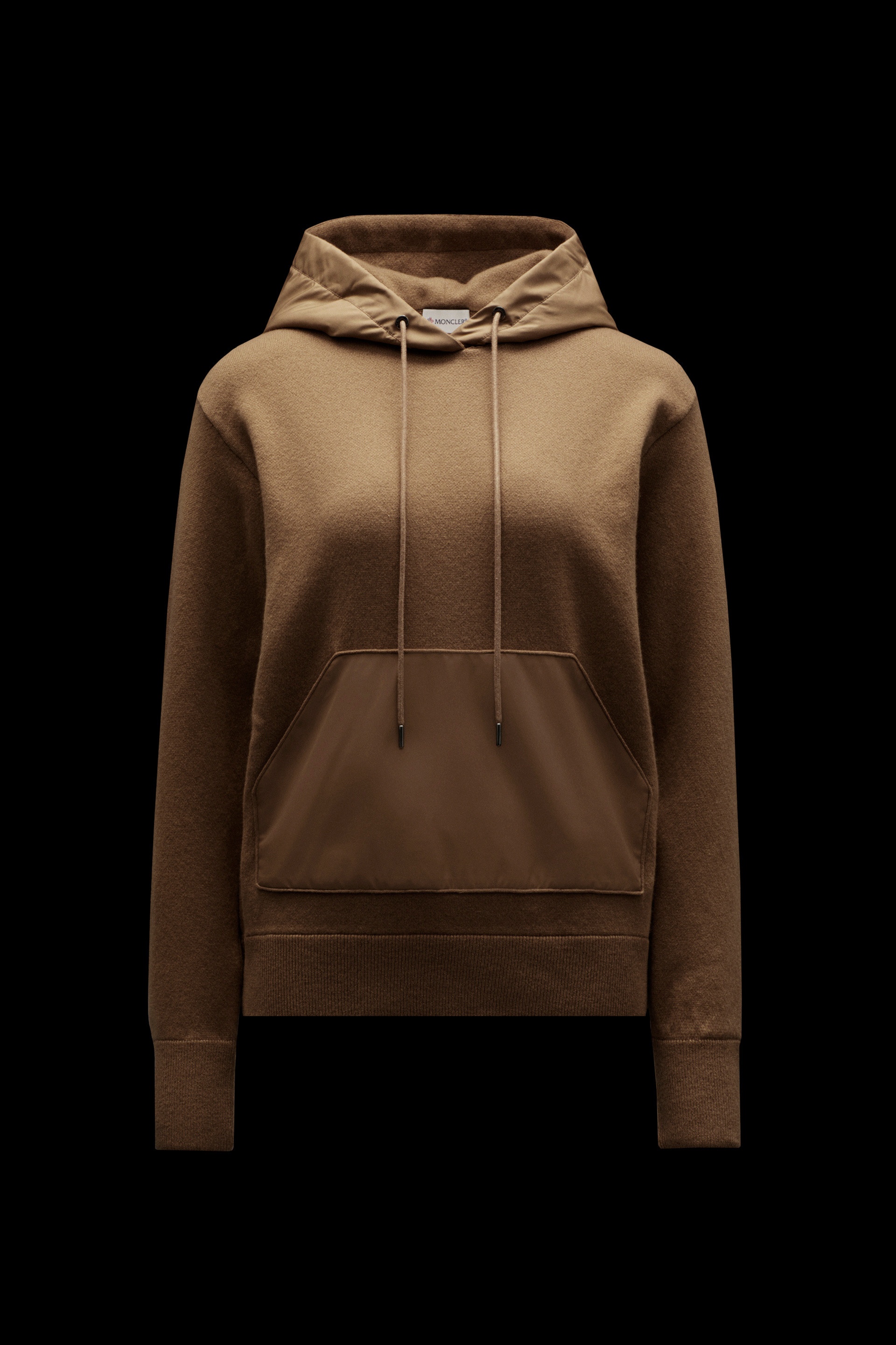 This sporty sweater is updated with a precious cashmere-blend yarn to define a new concept of contemporary elegance. A sweater that delivers relaxed luxury for those moments dedicated to yourself. Crafted in a wool and cashmere-blend, this style showcases a practical, modern design with a tonal nylon hood and kangaroo pockets. - Sweater for women - Crafted with twelve-gauge stitch wool and cashmere-blend yarn - “Sweatshirt stitch” knitting - Attached drawcord hood with nylon exterior - Nylon kangaroo pockets - Rib-knit edges - Felt Moncler logo on sleeve SIZE AND FIT - The model is wearing a size S and is 180 cm tall - Designed for a comfortable fit COMPOSITION AND CARE LINING: 100% Polyester; HOOD LINING: 70% Virgin wool, 30% Cashmere; HOOD: 100% Polyester; 1 MATERIAL: 100% Polyester; BASE FABRIC: 70% Virgin wool, 30% Cashmere Do not wash; Do not bleach; Do not tumble dry; Ironing maximum temperature 110°C - without steam; Dry cleaning in tetrachloroethene or with hydrocarbons - mild process; Do not professionally wet clean; Flat dry in the shade; Wash separately; It is advisable to wash and iron with the garment on reverse.; PROTECT TRIMS WHILE WASHING Product code G20939A00001M1127234 Made in Romania