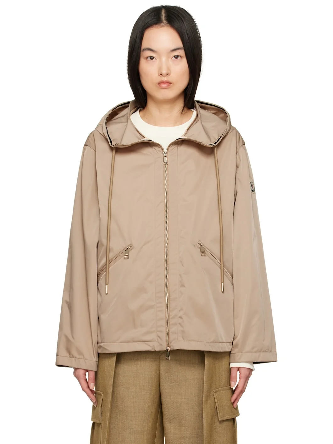 Lightweight polyester gabardine jacket. · Drawstring at hood · Two-way zip closure · Zip pockets · Bungee-style drawstring at hem · Felted logo patch at sleeve Supplier color: Beige 100% polyester. Made in Armenia 251111F063050
