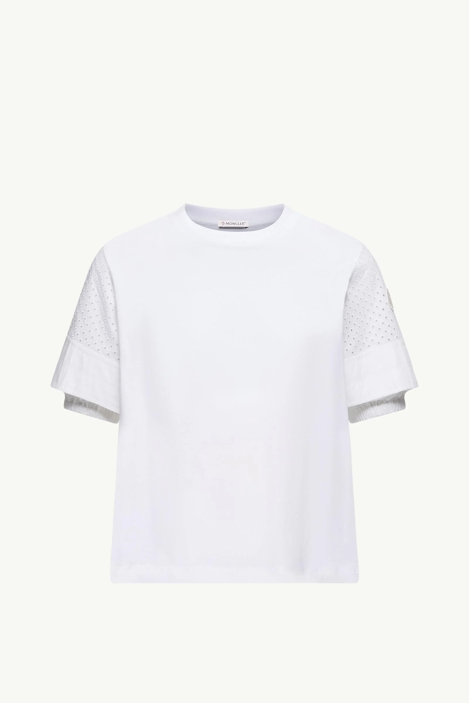 Simplicity meets sophistication in this women’s cotton t-shirt, elevated by San Gallo-embroidered balloon sleeves. Naturally soft and breathable, this t-shirt is crafted from cotton jersey. The design comes in a short sleeve shape, enhanced by San Gallo accents and balloon sleeves. DETAILS - Crafted from cotton jersey - Cotton poplin sleeves with San Gallo embroidery - Ribbed crew - Short Sleeves - Logo patch SIZE AND FIT - The model is wearing a size XS and is 178 cm tall - Regular fit COMPOSITION BASE FABRIC: 100% Cotton; Collar rib: 100% Cotton; 1 MATERIAL: 91% Cotton, 9% Polyester; 2 MATERIAL: 100% Cotton Product code L10938C0004589AUO001 Made in Turkey