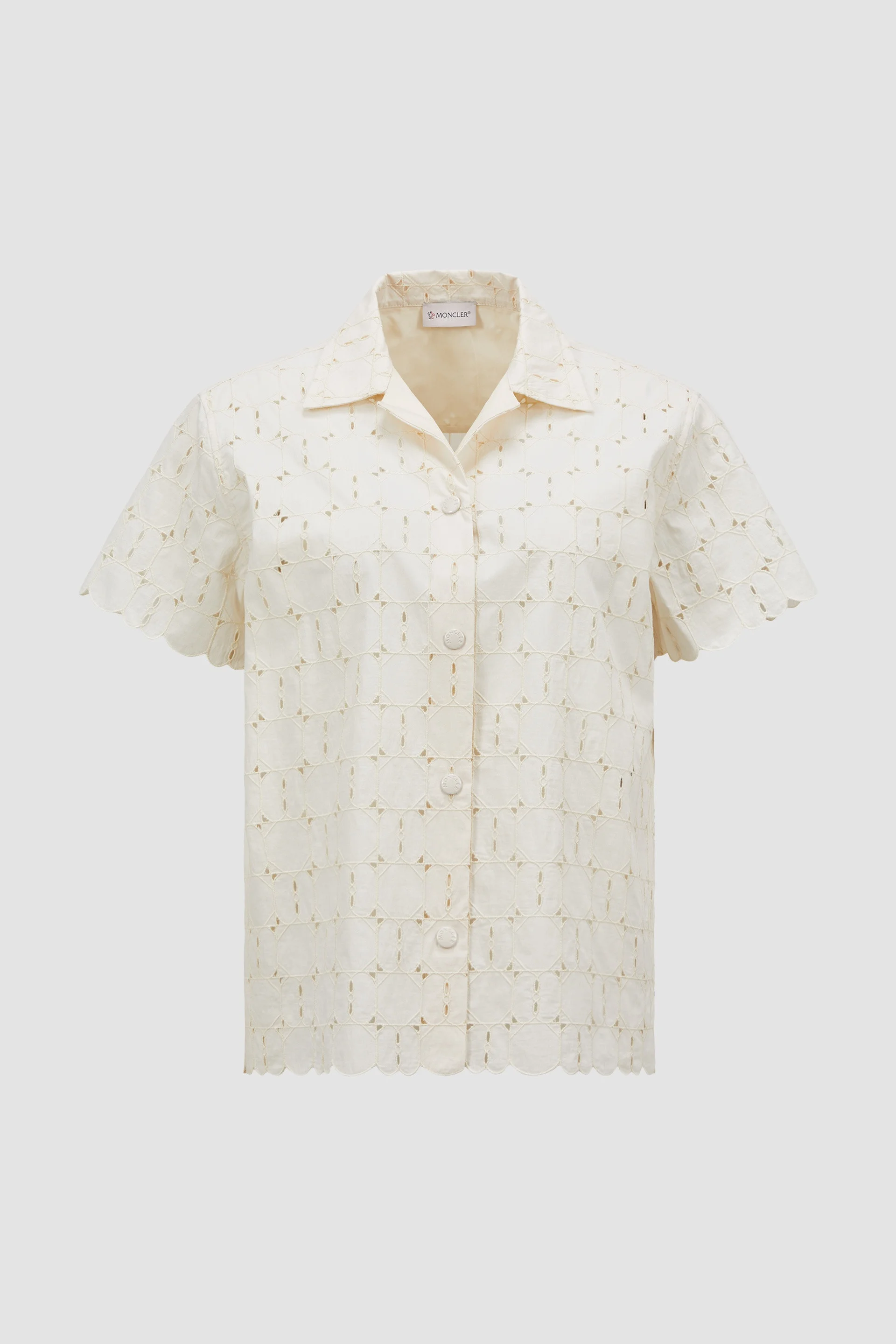 A refined take on a relaxed essential, this short sleeve shirt for women is crafted from broderie anglaise. Light and airy, this shirt is crafted from cotton blend broderie anglaise. The top boasts a geometric pattern that pairs with matching shorts, creating a total look fit for the city or the resort. DETAILS - Crafted from cotton blend broderie anglaise - Organic poplin lining - Collar - Short sleeves - Snap button closure - Logo patch SIZE AND FIT - The model is wearing a size 40 and is 179 cm tall COMPOSITION EXTERIOR: 85% Cotton, 15% Polyamide / Nylon; LINING: 100% Cotton; Embroidery: 89% Cotton, 11% Polyester Product code K10932F00012598IP034 Made in Romania