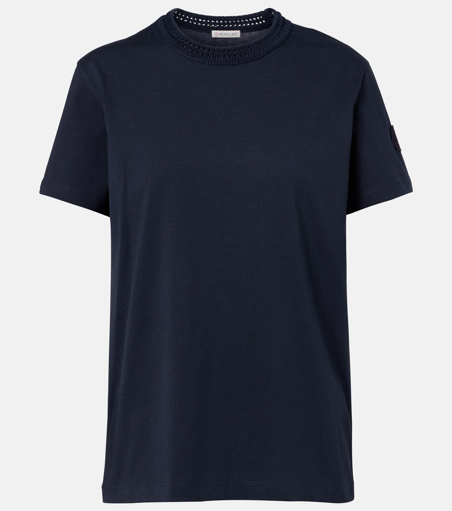 From extreme sports to day-to-day city living, Moncler covers all the bases. This T-shirt is crafted from cotton jersey and features a crochet collar. Product Details - Material: 100% cotton - Care instructions: machine wash at 30 degrees - Made in Turkey - Color: blue - Designer color name: 742 - Collar: crewneck - Item number: P01141823 Size & Fit - True to size - Straight fit - Slightly stretchy fabric - Falls below the hip - The model seen in the picture is 178cm-5'10" and wearing a size XS
