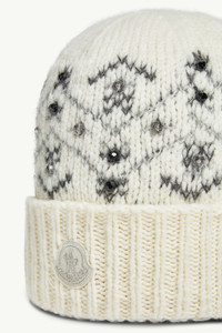 Inspired by quintessential knitwear, this beanie hat for women is adorned with a jacquard pattern. Imbuing a cold weather essential with a delicate feminine feel, this alpaca blend beanie is adorned with crystals. The hat stands out with an intricate jacquard motif, subtly nodding to classic knitwear. DETAILS - Crafted from an alpaca, wool and nylon blend - Gauge 3 - Hand-embroidered crystals - Logo patch COMPOSITION BASE FABRIC: 55% Alpaca, 23% Wool, 22% Polyamide / Nylon; 1 MATERIAL: 34% Alpaca, 26% Polyamide / Nylon, 23% Wool, 17% Mohair Product code K20933B00067M8190034 Made in Italy