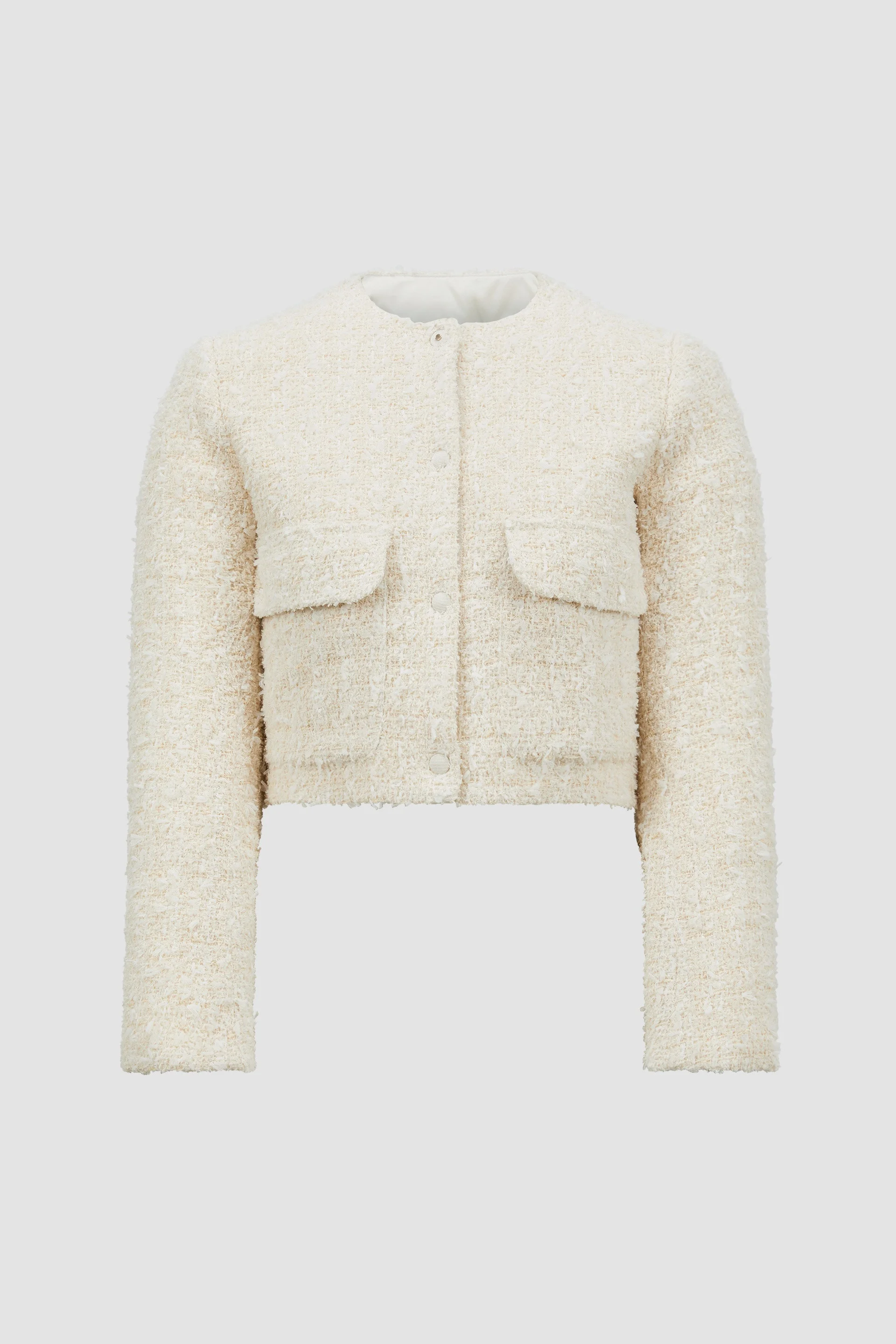Emblematic of comfortable elegance, the Dauphin short down jacket for women is crafted from soft tweed. A refined everyday piece, the Dauphin down jacket is made from an innovative type of tweed. The classic fabric is reimagined with a plush cotton feel and three-dimensional effect. Featured in a tailored shape, the short puffer is imbued with a feminine aesthetic. The collarless jacket can be paired with coordinating pieces from the collection, creating an elevated total look. DETAILS - Crafted from tweed boucle - Recycled polyester lining - Down-filled - Snap button closure - Flap pockets - Leather logo patch SIZE AND FIT - The model is wearing a size 0 and is 175 cm tall - The model measures: bust 76 cm, waist 59 cm, hips 86 cm - Regular fit COMPOSITION EXTERIOR: 81% Cotton, 15% Polyamide / Nylon, 4% Polyester; OUTER BACK: 100% Polyester; LINING: 100% Polyester; PADDING: 90% Down, 10% Feather;LEATHER TAG: COW LEATHER Product code K10931A00054598DVF00 Made in Romania