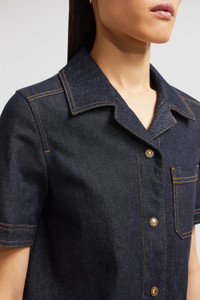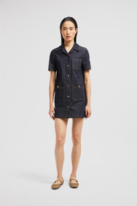 A fresh approach to a timeless design, this mini dress for women reimagines the classic denim shirt. Inspired by traditional workwear, this denim shirt dress features spacious patch pockets and a collar. The style's mini length and gold-toned buttons add a feminine feel. DETAILS - Crafted from denim - Cotton lining - Collar - Snap button closure - Pockets with snap button closure - Synthetic material logo tag SIZE AND FIT - The model is wearing a size 40 and is 180 cm tall COMPOSITION BASE FABRIC: 98% Cotton, 2% Elastane / Spandex Product code K10932G00007597BH77A Made in Romania