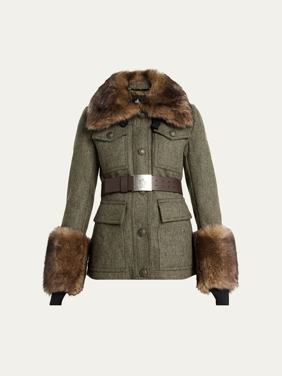 Adorned with luxurious dyed lamb shearling (France) trim, the "Devez" field jacket by Moncler is crafted from wool gabardine with premium down insulation for a unique silhouette that is both stylish and warm. Signature embroidered logo patch on the left sleeve Adjustable spread collar Long sleeves with stretchjersey wrist gaiters Dual chest and hip flap pockets; inner medium pocket Detachable, adjustable calf leather belt with logoengraved buckle Classic fit Powder skirt Zipfront with snapover placket Leather/nylon/polyamide/virgin wool Fill: Down/feather Lining: Polyester Dry clean only Imported