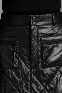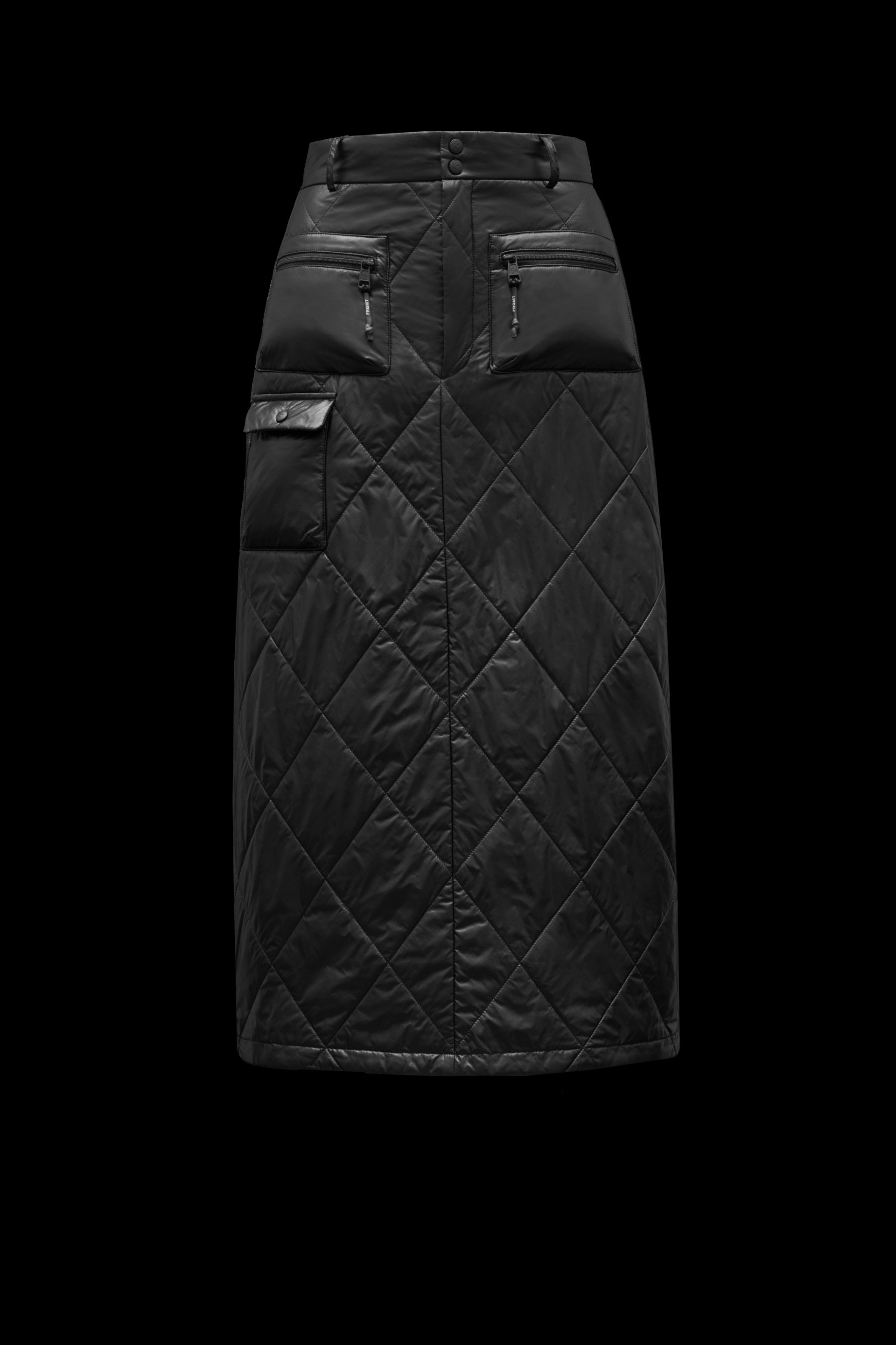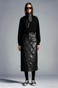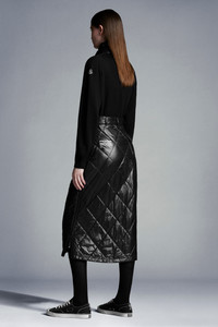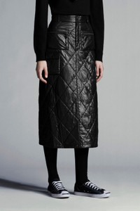 Crafted in recycled shiny nylon laqué, this midi skirt is part of the 7 Moncler Frgmt Hiroshi Fujiwara line, collection n° 7 of the Moncler Genius project. Combining a feminine attitude with Moncler’s signature spirit, this skirt showcases a midi A-line silhouette and is crafted in recycled shiny nylon laqué with diamond quilting. The style is finished with long side zippers and signature graphic details of the Moncler Frgmt Hiroshi Fujiwara line, collection n° 7. - Midi skirt for women from the Moncler Frgmt Hiroshi Fujiwara line, collection n° 7 - Crafted in recycled shiny nylon laqué - Down filled and diamond quilted - Nylon léger lining - Zipper fly with button closure - Long side zippers, zipper pulls with rubberized knots and Moncler FRGMT lettering - Front patch pockets with zipper closures, zipper pulls with rubberized knots and Moncler FRGMT lettering - Low front pocket and rear pocket with flaps and logo button closures - "Moncler/Frgmt, Design G. Studio" graphic on back - Length: 80 cm - Regular fit SIZE AND FIT - The model is wearing a size 40 and is 177 cm tall COMPOSITION AND CARE EXTERIOR: 100% Polyamide / Nylon; LINING: 100% Polyamide / Nylon; PADDING: 85% Down, 15% Polyester Hand wash; Do not bleach; Do not tumble dry; Ironing maximum temperature 110°C - without steam; Do not dry clean; Do not professionally wet clean; Flat dry in the shade; Wash separately; Do not twist or wring; do not soak; It is advisable to wash and iron the garment on reverse. Product code G209U2D0000153A0E999 Made in Romania