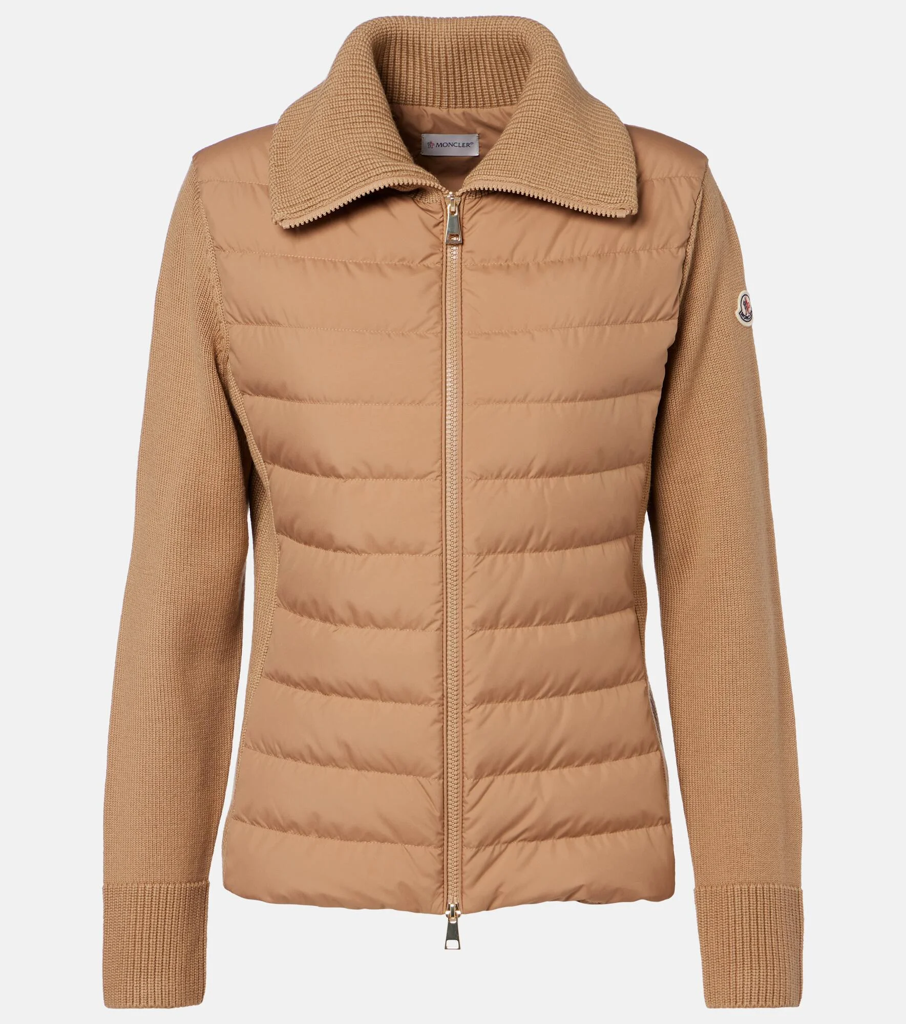 Filled with warm down, this signature paneled cardigan comes with knitted wool sleeves. Exclusively sourced from DIST-certified suppliers, all Moncler down is derived from farmed geese as a byproduct of the food industry. Product Details - Material: 100% polyester - Care instructions: dry clean - Made in Moldova - Color: brown - Designer color name: 248 - Item color: brown - Material II: 100% polyester - Material III: 100% virgin wool - Lining: 100% polyester - Filling: 90% down, 10% goose feathers - Contains non-textile parts of animal origin - Hardware color: gold - Closure: two-way zipped front - Item number: P01127315 Size & Fit - True to size - Cinched waist - Partly stretchy fabric - Falls to the hip - The model seen in the picture is 178cm-5'10" and wearing a size XS