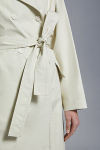 Worn as a trench coat or as a long vest, the Elyme is a versatile addition to a woman's wardrobe. Modern and sophisticated, the Elyme trench coat layers perfectly over work and eveningwear. Crafted from cotton, the loose coat comes in a timeless double-breasted and belted silhouette. Boasting detachable sleeves, the coat doubles as a vest. - Crafted from 3L cotton - Detachable sleeves - Snap button closure - Detachable belt - Flap pockets - Double-layered jacquard logo SIZE AND FIT - The model is wearing a size 0 and is 180 cm tall - The model measures: bust 77 cm, waist 61 cm, hips 88 cm - Loose fit COMPOSITION AND CARE EXTERIOR: 87% Cotton, 13% Polyester; LINING: 100% Polyamide / Nylon Do not wash; Do not bleach; Do not tumble dry; Ironing maximum temperature 110°C - without steam; Dry cleaning in tetrachloroethene or with hydrocarbons - mild process; Do not professionally wet clean; Flat dry in the shade; Wash separately; It is advisable to wash and iron the garment on reverse. Product code J10931C0002554A3K21F Made in Romania