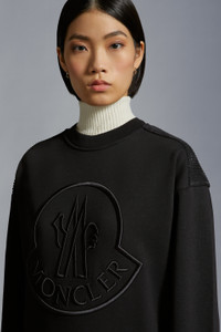 Unmistakably Moncler, this oversized sweatshirt for women is adorned with a maxi logo. Soft and cozy, this sweatshirt is crafted from cotton fleece. The oversized turtleneck is embellished with an embroidered logo. - Crafted from cotton fleece - Cotton jersey lining - Ribbed crew neck - Corduroy shoulder inserts - Embroidered logo SIZE AND FIT - The model is wearing a size XS and is 177 cm tall - The model measures: bust 78 cm, waist 60 cm, hips 88 cm - Oversized fit COMPOSITION AND CARE 1 MATERIAL: 85% Polyester, 15% Polyamide / Nylon; Embroidery: 100% Polyester; BASE FABRIC: 91% Cotton, 9% Polyamide / Nylon; Ribs: 98% Cotton, 2% Elastane / Spandex Wash max 30°C - Very mild process; Do not bleach; Do not tumble dry; Ironing maximum temperature 110°C - without steam; Do not dry clean; Professional wet cleaning - very mild process; Flat dry in the shade; Wash separately; Wash inside out; Iron inside out Product code I20938G00042899U5999 Made in Turkey