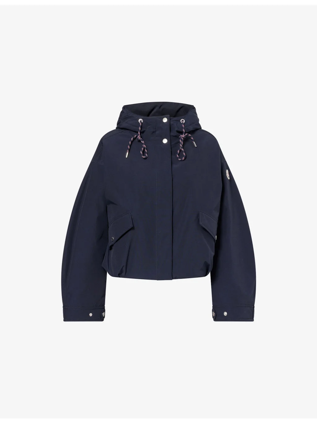 PRODUCT DETAILS - Moncler down jacket - 84% polyester, 16% cotton; filling 100% polyamide; lining 100% polyamide - Exposed press-stud and concealed zip fastening at front - Relaxed fit, adjustable drawstring hood, long sleeves, brand badge at sleeve, adjustable press-stud cuffs, two front flap press-stud pockets, branded silver-toned hardware, down-filled drawcord hem - Hand wash - Made in Romania - True to size - Size small: length 21in / 53cm - Model is 5ft 10in/1.78m and wears a size small - Midweight, non-stretch Ref: R04569338