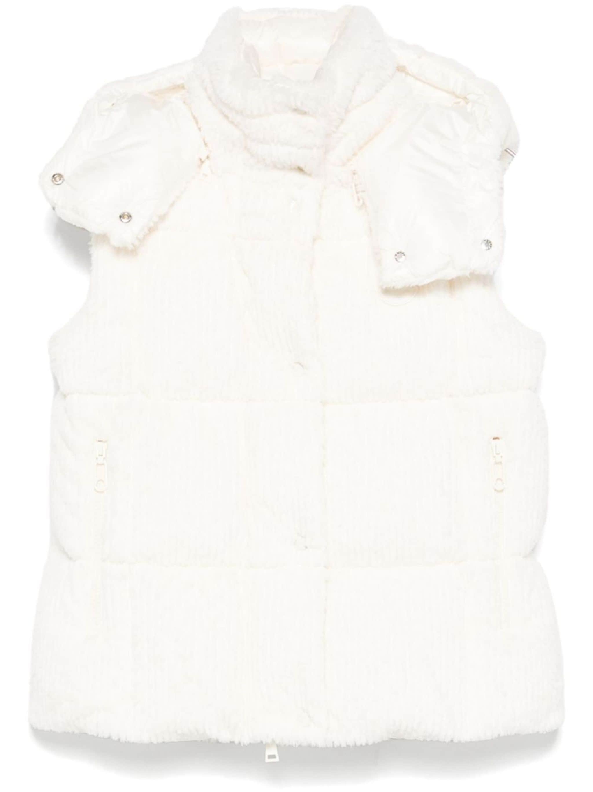 white faux-fur design padded design goose down-feather filling two-way zip fastening front press-stud fastening detachable drawstring hood stand-up collar sleeveless logo patch at the chest two side zip-fastening pockets full lining straight hem Size & Fit Model Measurements: Height: 1.75 m Bust/Chest: 86.0 cm Hips: 92.0 cm Waist: 66.0 cm Model wears size 0 Fabric and Care Designer Style ID: J20931A00144596C3 Designer Colour: 034 WHITE Composition: Outer: Polyester 100%; Lining: Goose down 90%, Polyamide 100%, Feather 10% Washing instructions: Dry Clean Only Made in Romania