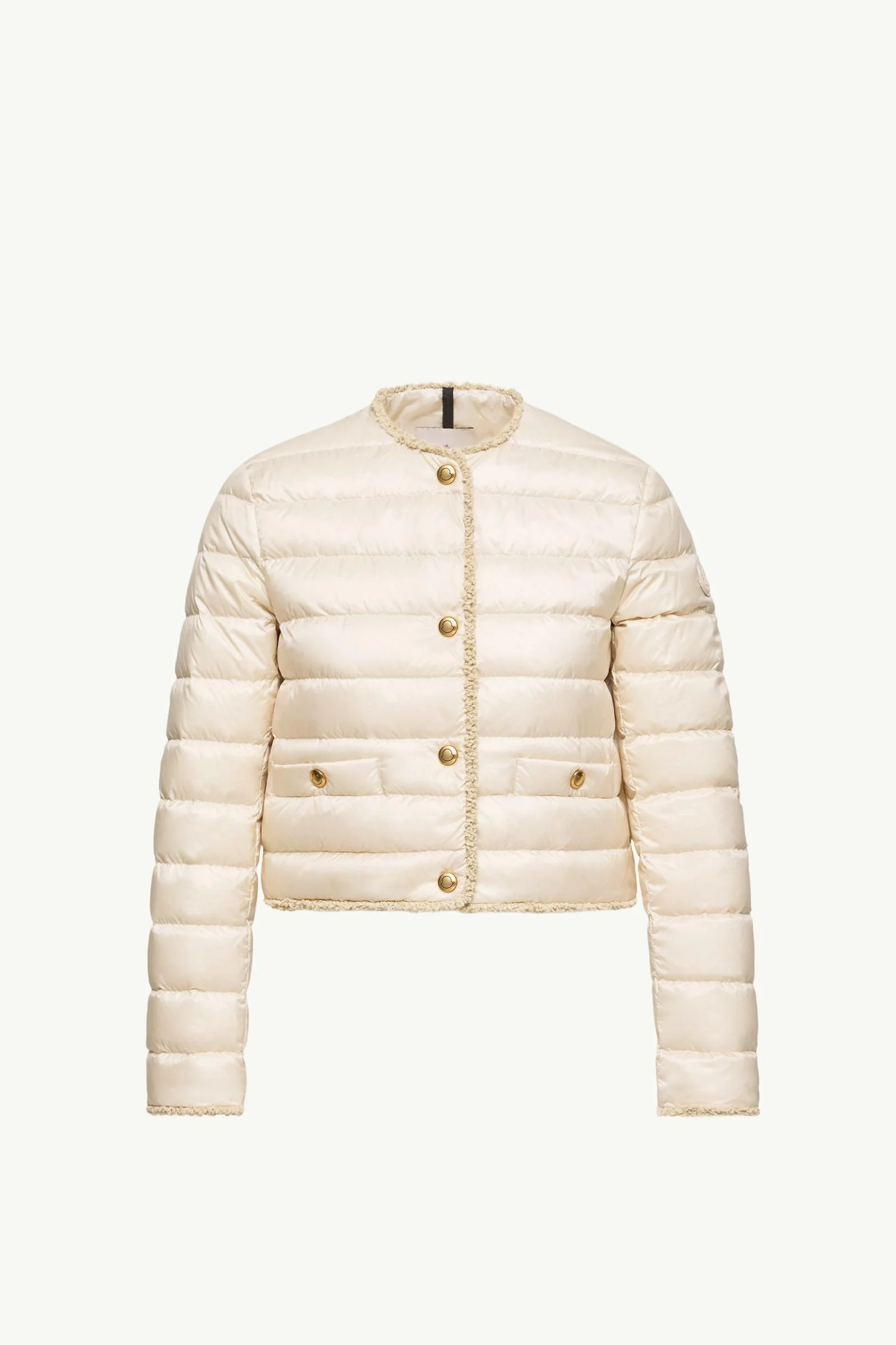 Adding a touch of elegance to a classic design, the Fleurs short down jacket for women is animated by boucle accents. Playing with textural contrast and sophisticated lines, the Fleurs pairs boucle trims with a rounded neckline. Perfect for the mid-season, the puffer is crafted from longue saison - a nylon fabric known for its water-repellent protection and lightweight warmth. Vintage-infused hardware completes the design. DETAILS - Crafted from longue saison - Water-repellent main fabric - Longue saison lining - Boucle trim - Down-filled - Snap button closure - Pockets with button closure - Leather logo patch SIZE AND FIT - The model is wearing a size 0 and is 177 cm tall - Regular fit - Length (collar to hem): 50 cm COMPOSITION EXTERIOR: 100% Polyamide / Nylon; LINING: 100% Polyamide / Nylon; PADDING: 90% Down, 10% Feather;LEATHER TAG: CALF Product code L10931A00104597YF20N Made in Romania
